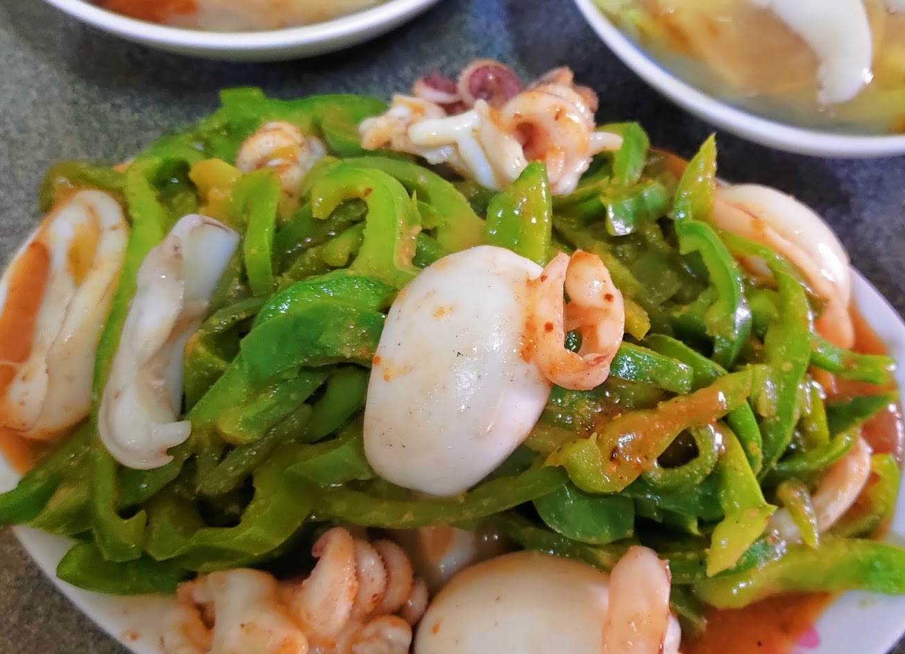 只有賣兩種餐點:花枝羹(70元)跟生炒花枝(150元,可以炒青椒或高麗菜),花枝羹是清甜路線,裡面滿滿的花枝跟高麗菜;生炒花枝炒青椒就是下飯菜流派,帶有一點沙茶味非常鹹香好吃~好想配白飯啊~