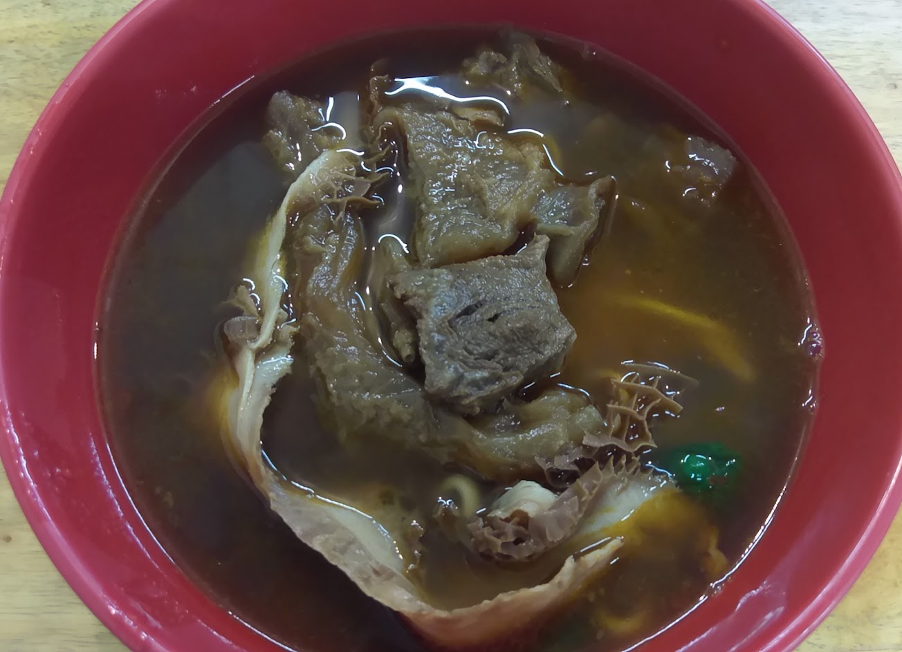 我點的是半筋半肉外帶,肉處理方式明顯與之前吃不相同,筋很大塊但有一塊略帶脆脆的口感,另一塊很優秀;肉偏柴雖然很薄;湯頭尾韻的甜味沒了;青江菜超豪邁的大小啊!其他與之前吃過的大同小異。