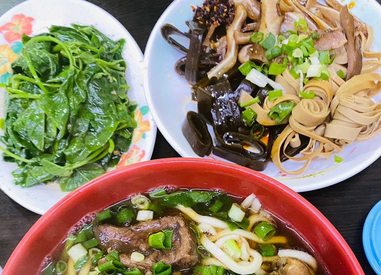 湯頭不死鹹、麵條Q彈,小菜選擇多而且夠味。小菜上桌前會加點麻油跟醬油,味道非常香、鹹甜鹹甜很好吃。 單點牛肉湯裡面肉塊很多,份量十足,而且還有半筋半肉,CP值很高;牛肉下方鋪墊一小把空心菜,有菜有肉滿均衡的。