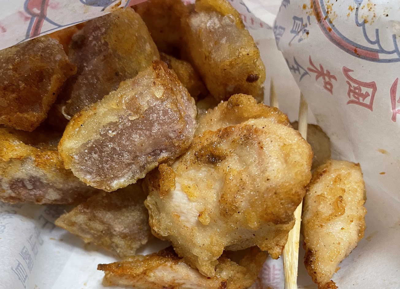 屬於裹粉的炸物,個人覺得蠻好吃的~也蠻乾淨的,不會看到很多油垢的那種感覺。不過竹籤需要的人要記得自己拿喔(拿餐的時候旁邊都會有小牌子提醒)