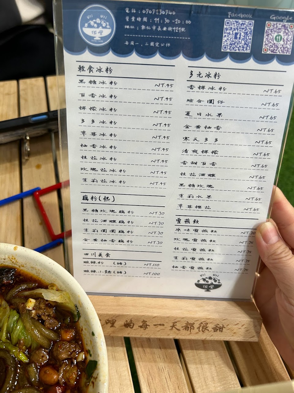 彰化也有冰粉了!位於肉圓街上的优哩,提供冰粉、酸辣粉、桃膠雪燕等川味小食。炎熱的夏天適合在飯後來杯沁涼的冰粉,店家提供不同等級的冰粉,想要簡單風味的就選輕食冰粉,想要水果或配料就選多元冰粉。