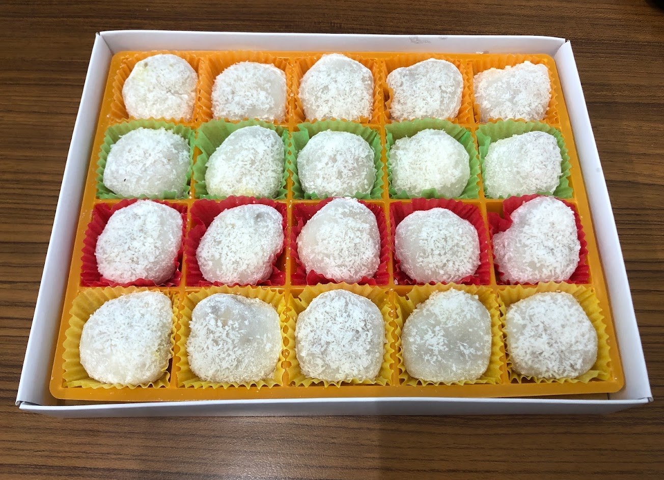 鹹麻糬,外面皮Q,內餡有香,鹹度剛好。一次買20顆一盒,只能5顆一組選口味,不能客製化,很可惜。