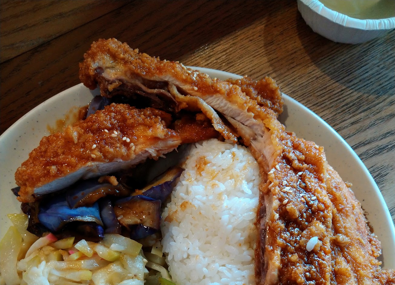 出餐快速,碳烤雞腿非常美味,配菜有時會掉漆,不是太鹹或是太老,白飯烹調有85分了,外邊的人行道有警察會取締,停車要小心