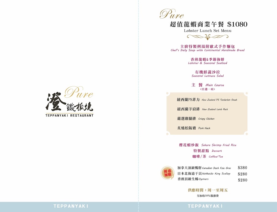 Lobster & Seasonal Seafood 胡麻沙拉 Daily Soup with Continental Handmade Bread Spanish Iberico Pork Japanese Wagyu Ribeye Cop Steah