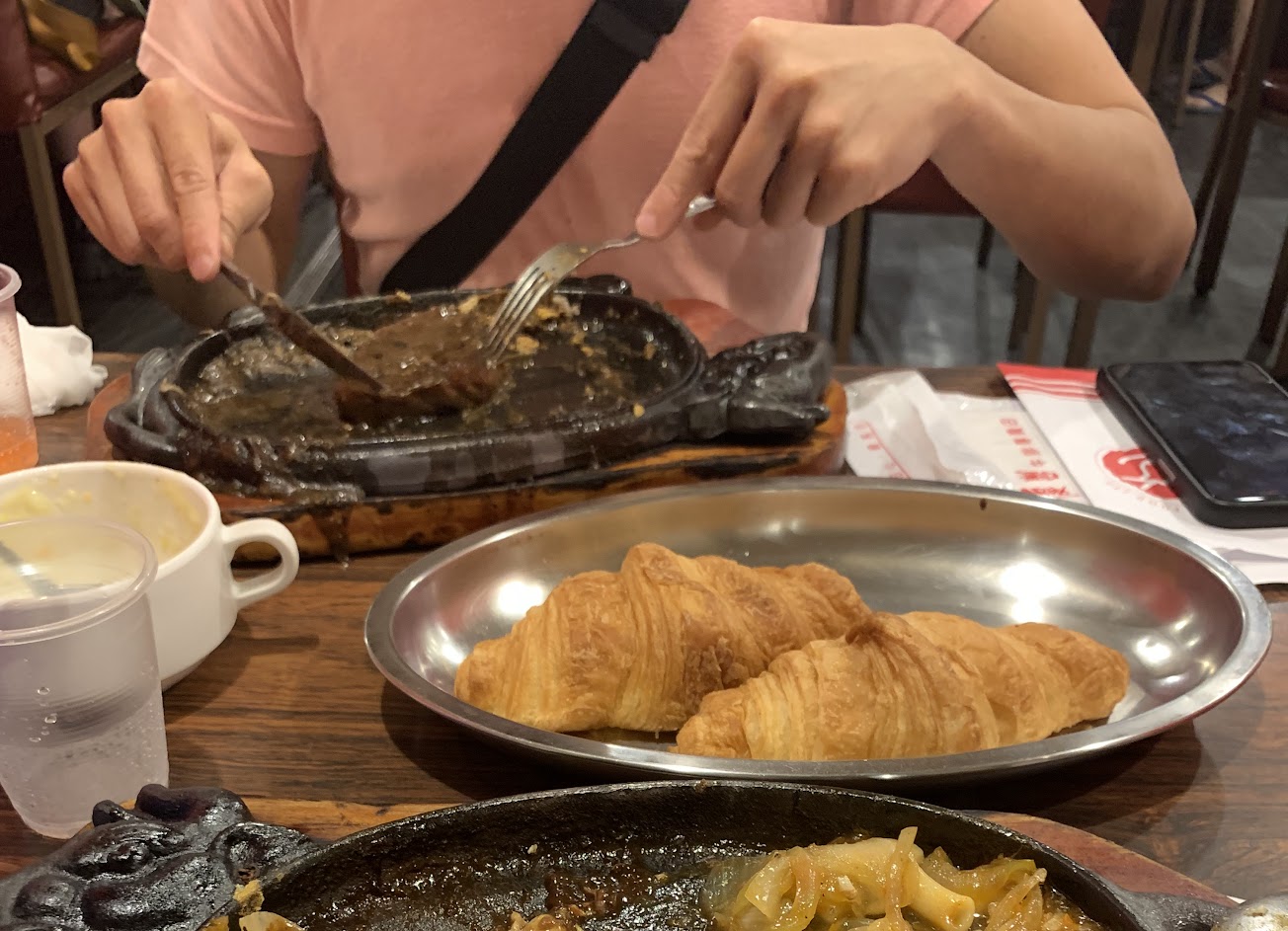 牛肉處理得不錯,不會有大塊的筋咬不動之類的問題發生,套餐會附一碗玉米濃湯,濃湯的奶油味很香、洋蔥也切得很細、整體香氣很足夠!麵包的部分我們原本還以為是普通餐包,結果送上來的是可頌,可單吃可泡在玉米濃湯裡變酥皮濃湯?