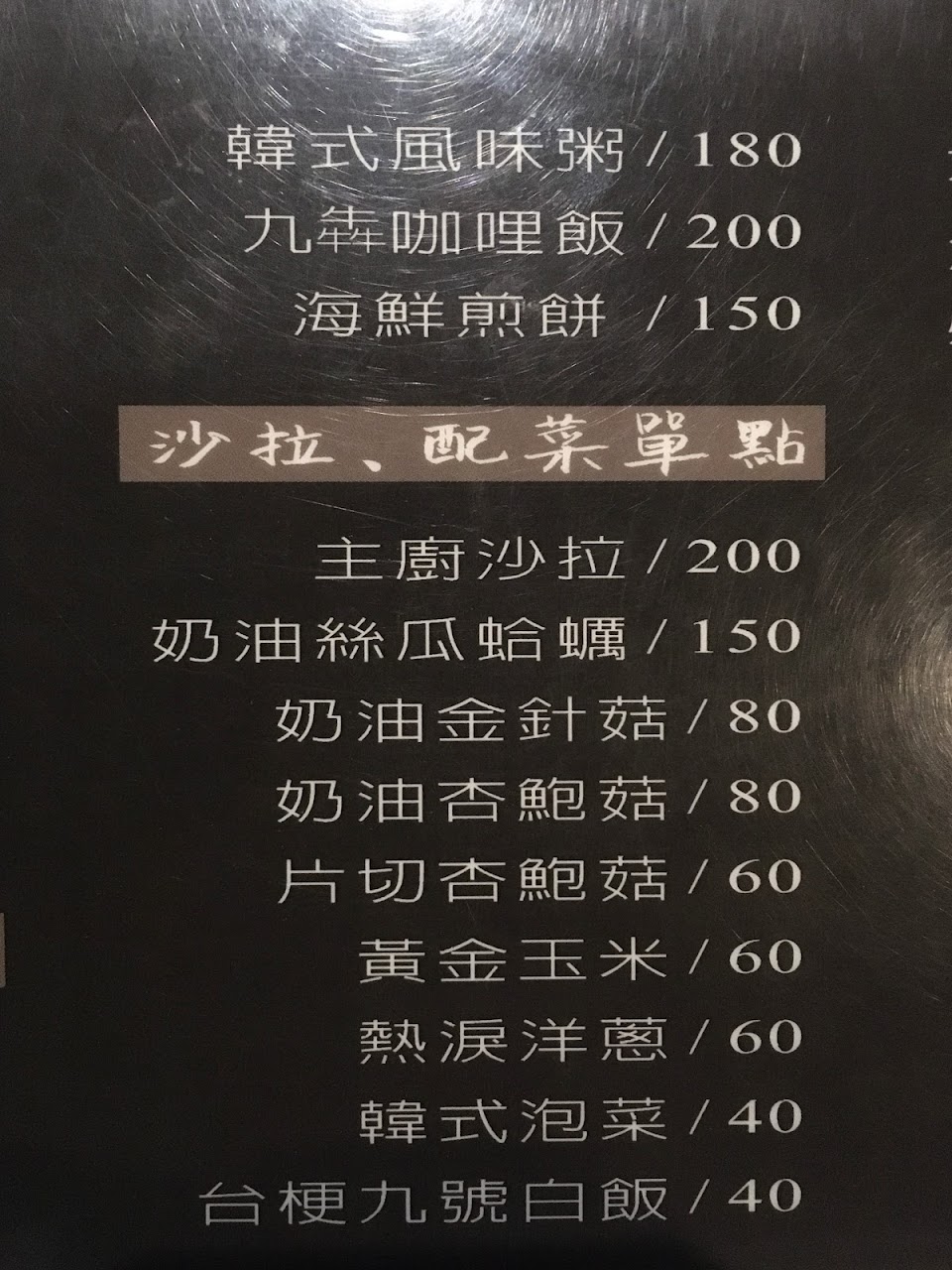 老公把雙人價看成單人價,還以為會出兩份,傻眼,結果比預期少吃一倍,價格當然只付預期的半價。每家烤肉都會膩,但九犇不會膩到想吐,推薦怕胖或減肥中的人點最便宜的剛剛好!肉好吃!沙拉讚!湯偏鹹。飲料無限供應。
