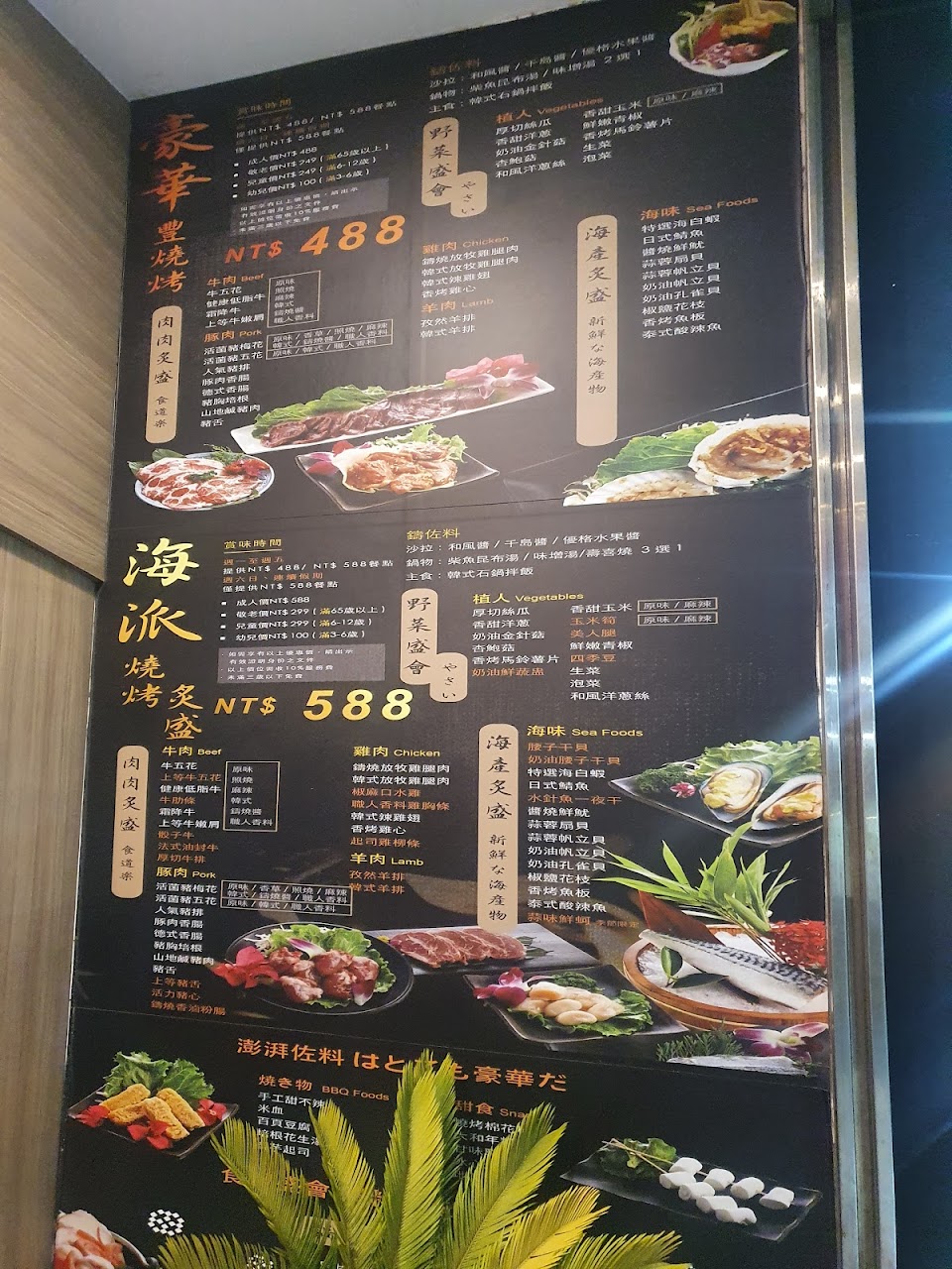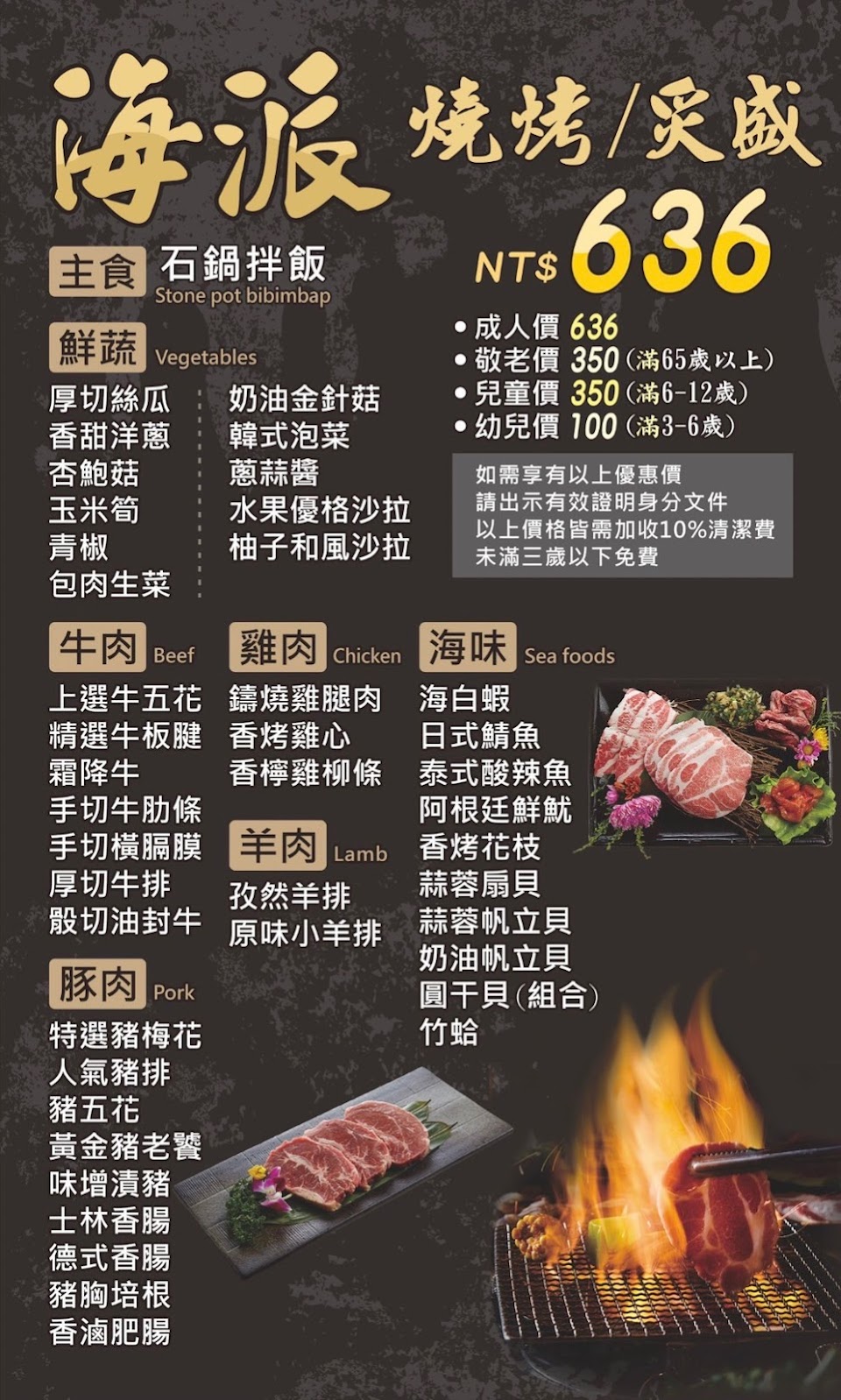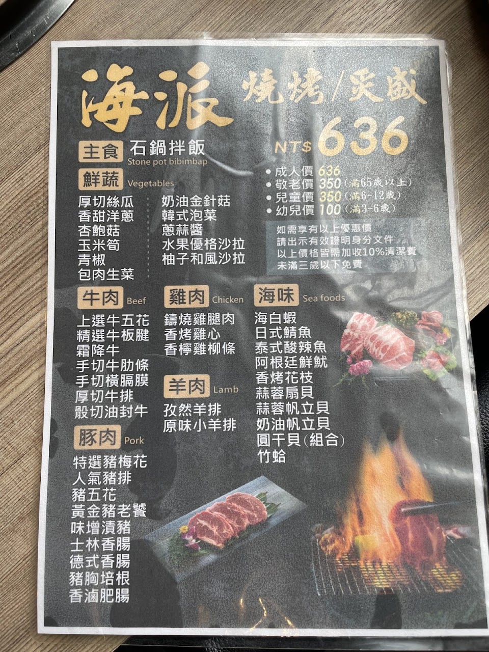 室內人少煙多,烤網下的木炭很靠近食物,烤出來肉都黑了(不是焦),肉很柴,兩顆星全是給海鮮,價位只有636加一成服務費,沒有其他價位,熟食少,個人認為“踩雷”了