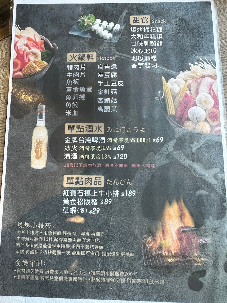 食材種類不多,但還算好吃 周邊熟食類及飲料很少 可能生意沒有很好 為了保持新鮮吧!因為我們是4個大人用餐 一個烤爐 限時90分鐘 對我們來說真的吃不飽 所以這次用餐 希望能多加一個烤爐,(之前在烤狀猿都是可以的)結果竟然要多加100元 那當下我們如果拆成2桌 店家不是也要消耗2個烤爐嗎?而且還會佔2個桌位 所以是建議店家可以不用這麼計較 偶爾給客人一些方便 客人也會常去並推薦親朋好友的這樣生意才能越做越大