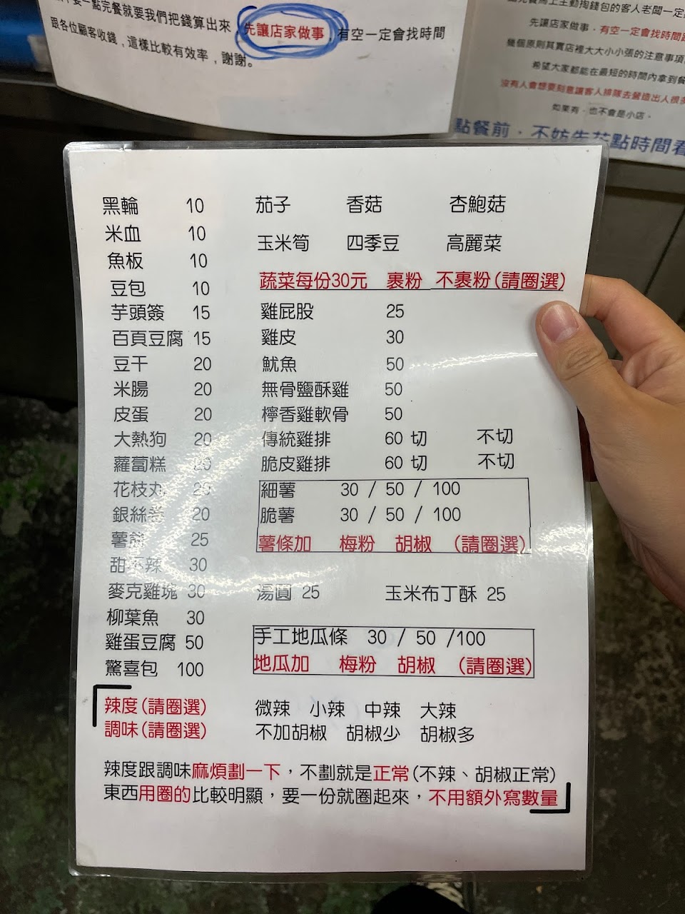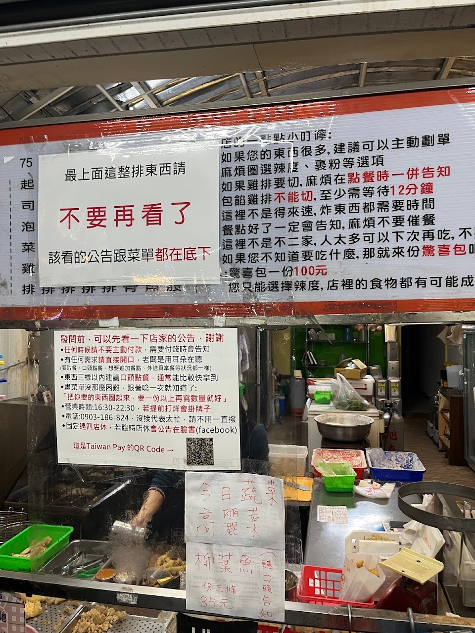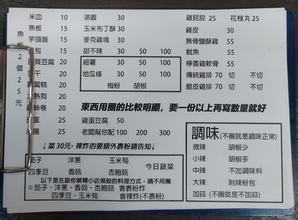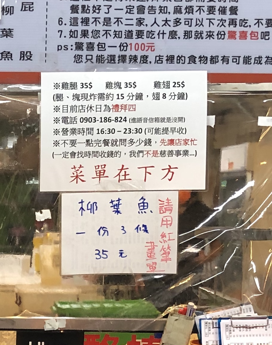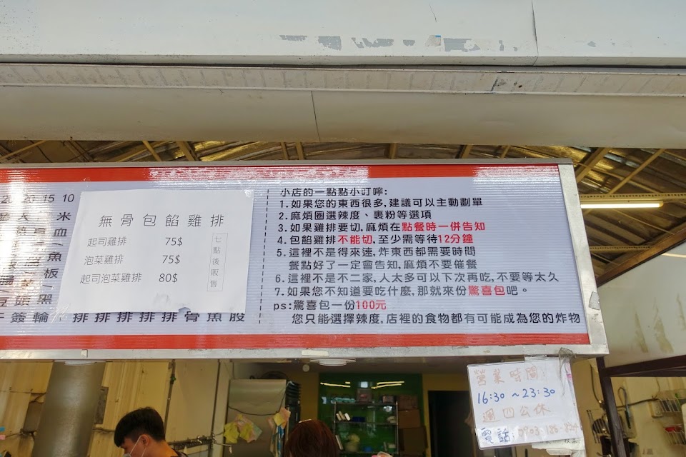 雞排好吃 不知道吃甚麼的 可以點100元驚喜包 但是限兩包 驚喜包很花時間 老闆忙不過來 萬一不知道吃甚麼 可以點200元任意搭 這樣老闆會比較好處理喔 老闆有自己的原則 可能是對美食還有店名的堅持