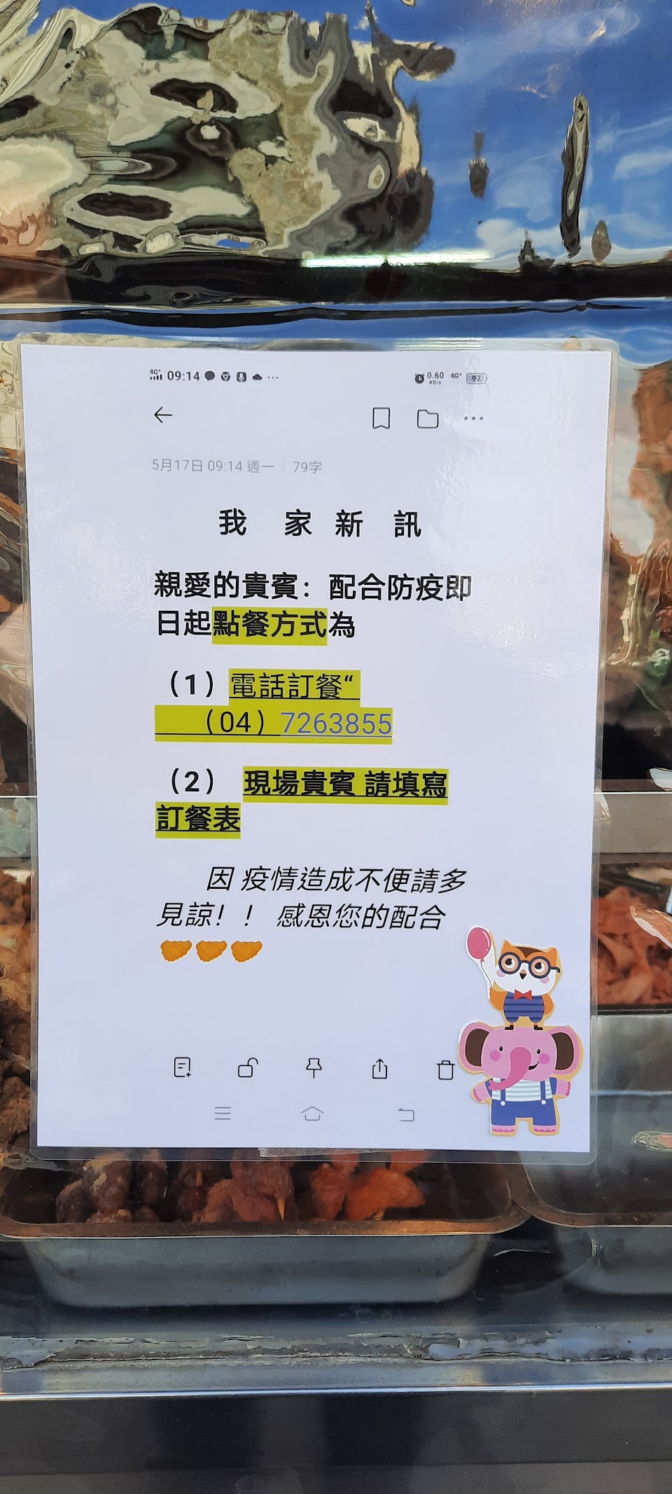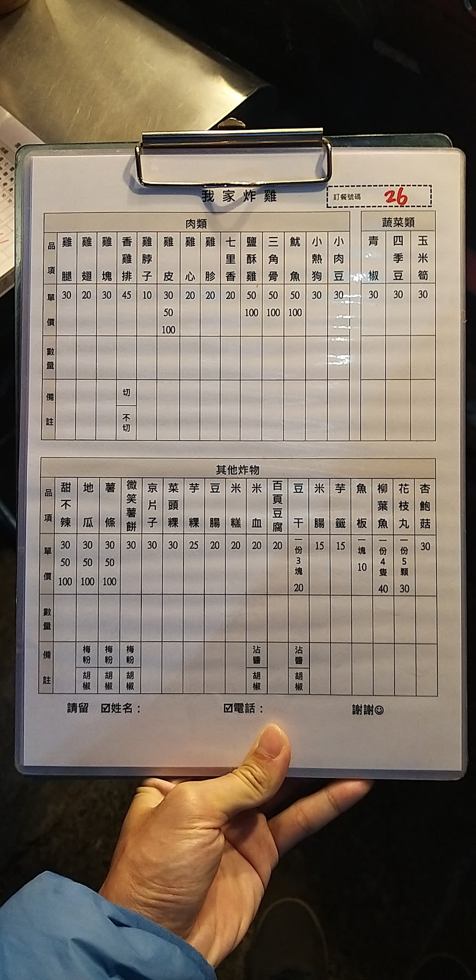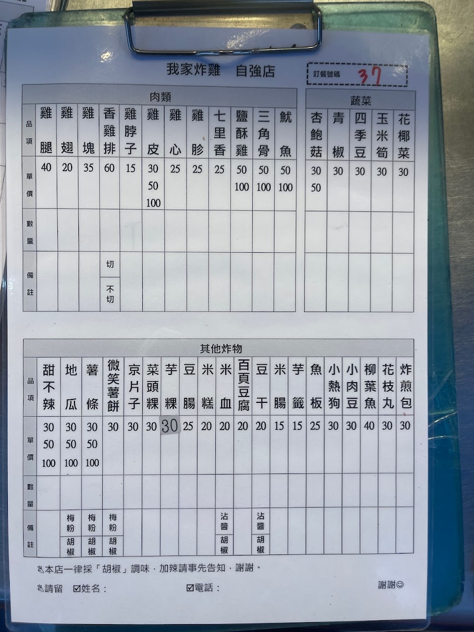 1. 店面前,有張銀色桌子,擺放多張寫好號碼(右上角)的菜單,現場提供簽字筆畫記,點餐完給老闆,等取餐叫號。