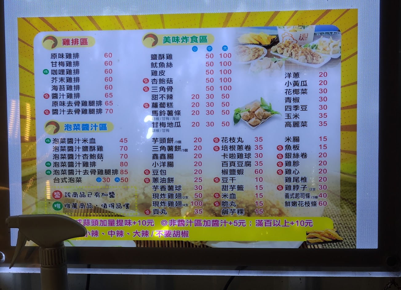 炸物價位偏高,味道普通,抬頭價目表有小中大的價錢,實際購買,老闆娘卻說現在價位是50、100元計算,然後再遞另一份菜單結算。