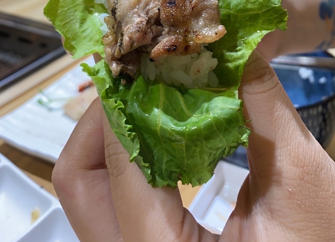 烤網真的很小巧,大概放兩片肉就滿了,越光米飯Q軟,小菜就見仁見智,惟一開始的火候設定較大,導致牛雪花片完全變成炒牛肉,油脂及肉末容易殘留在烤網上,所以這次用餐換了五次烤網有吧….實屬可惜
