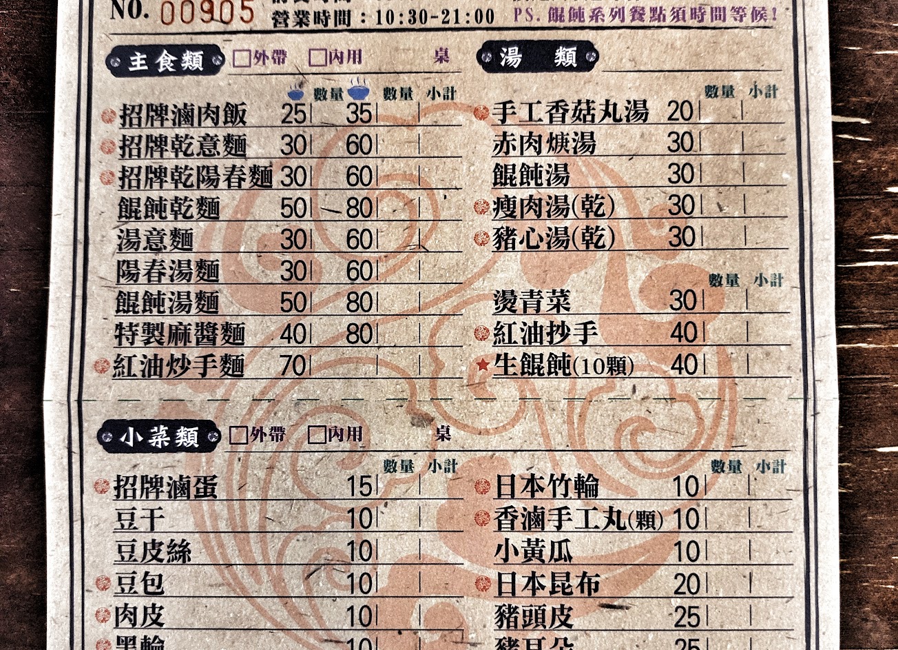 會考結束晚上入內用餐,內用環境不優,側推門有重量不好閉合,邊吃邊趕蚊子,抽風機過高,廚房熱氣排出效率不佳,夏天內用時像打仗(冬天可能比較溫暖),外送單food panda一台接一台,乾麵味道不錯有香氣,滷味有入味加分,燙清菜居然是跟乾麵及餛飩湯相同的小白菜(那我幹嘛叫燙青菜呢?),而且居然沒燙熟….苦苦的(都是外送單太多-趕時間害的啦)!