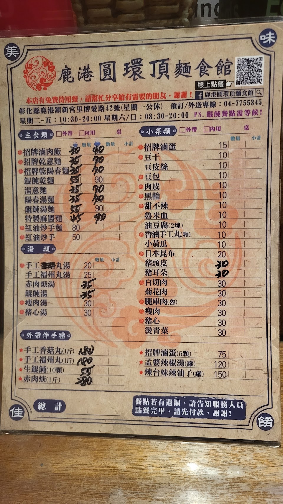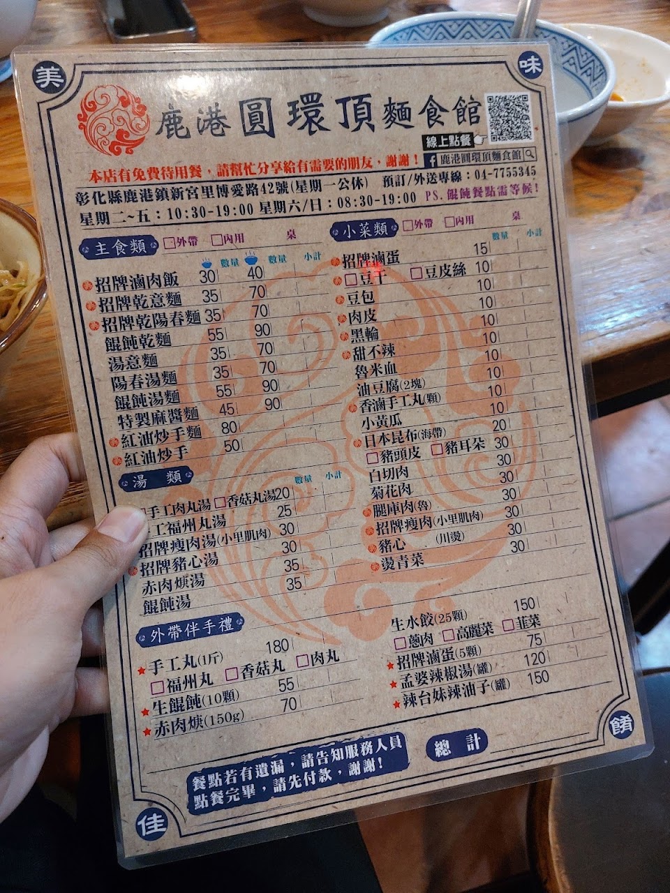 雖然內部空間不大,座位有限,但復古擺設、環境乾淨跟美味餐點,讓從桃園騎著重機至鹿港一日遊的我,在人生地不熟的狀況下,能夠滿足口腹之慾,也不用考慮到衛生問題。另外,在麵食館門口,還有工作人員(不清楚是不是老闆娘)除了會遞送點菜單跟安排座位外,還會親切的指引停車位置…以上種種值得推薦給大家~