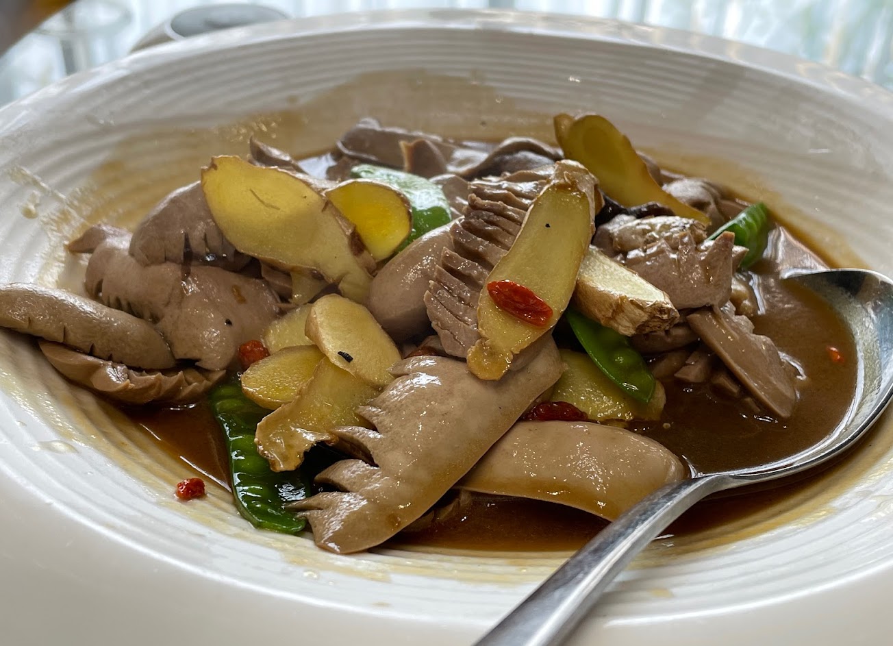 菜色多樣,拼盤香腸中包有酸甜的心類似金橘一類,好吃。蝦子新鮮水燙就好吃,魚鮮美,炸魚片用生菜包魚裹漿炸很酥脆,棕葉包芋頭蝦仁排骨,竹筍等等,如同用棕葉包了佛跳牆,海鮮羹鮮甜可口。湯感覺不多但其實足夠,花枝魚漿髮菜絲。