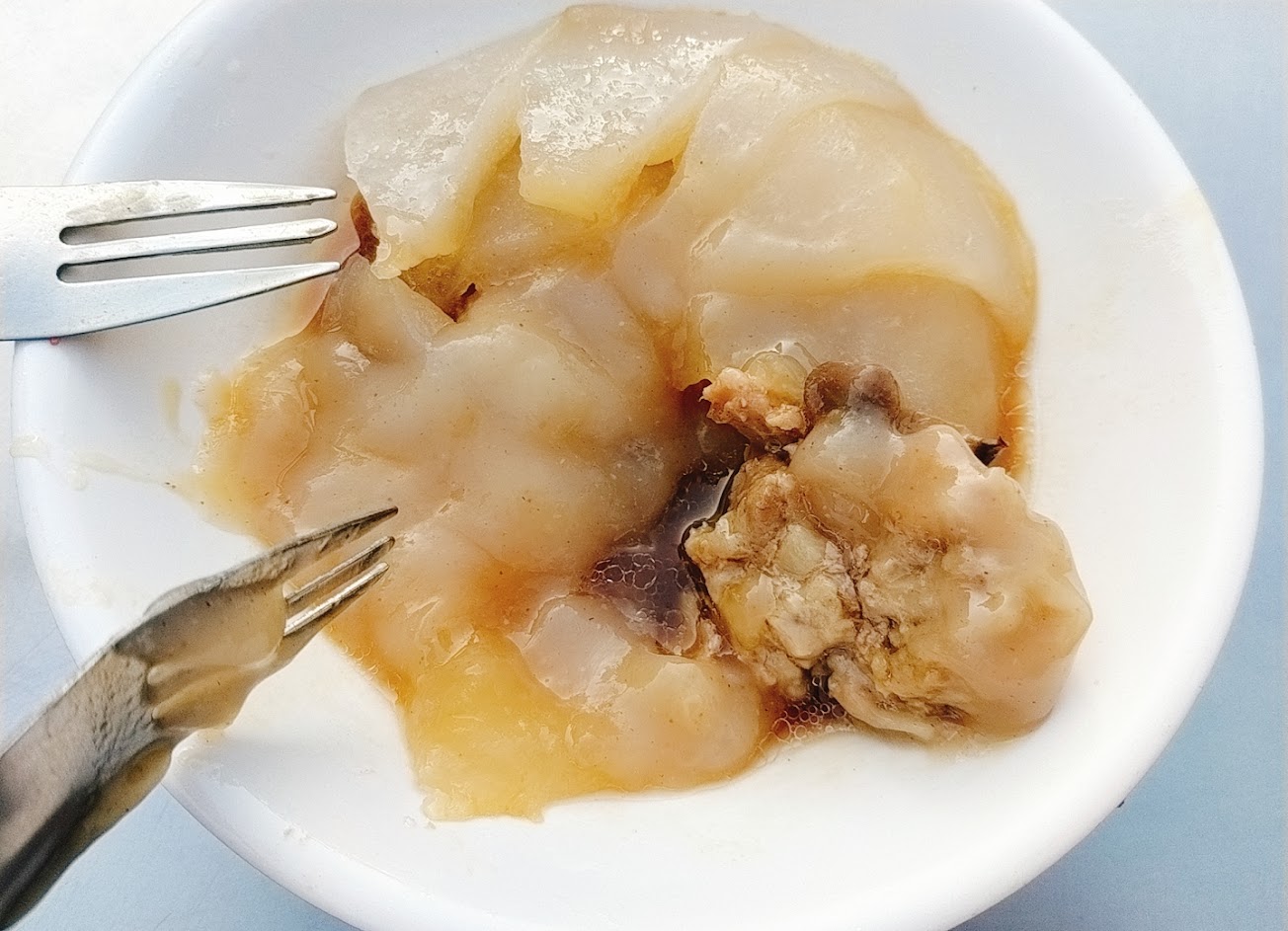 肉圓外皮是熱的,內餡的肉是冷的,根本還沒熟透。