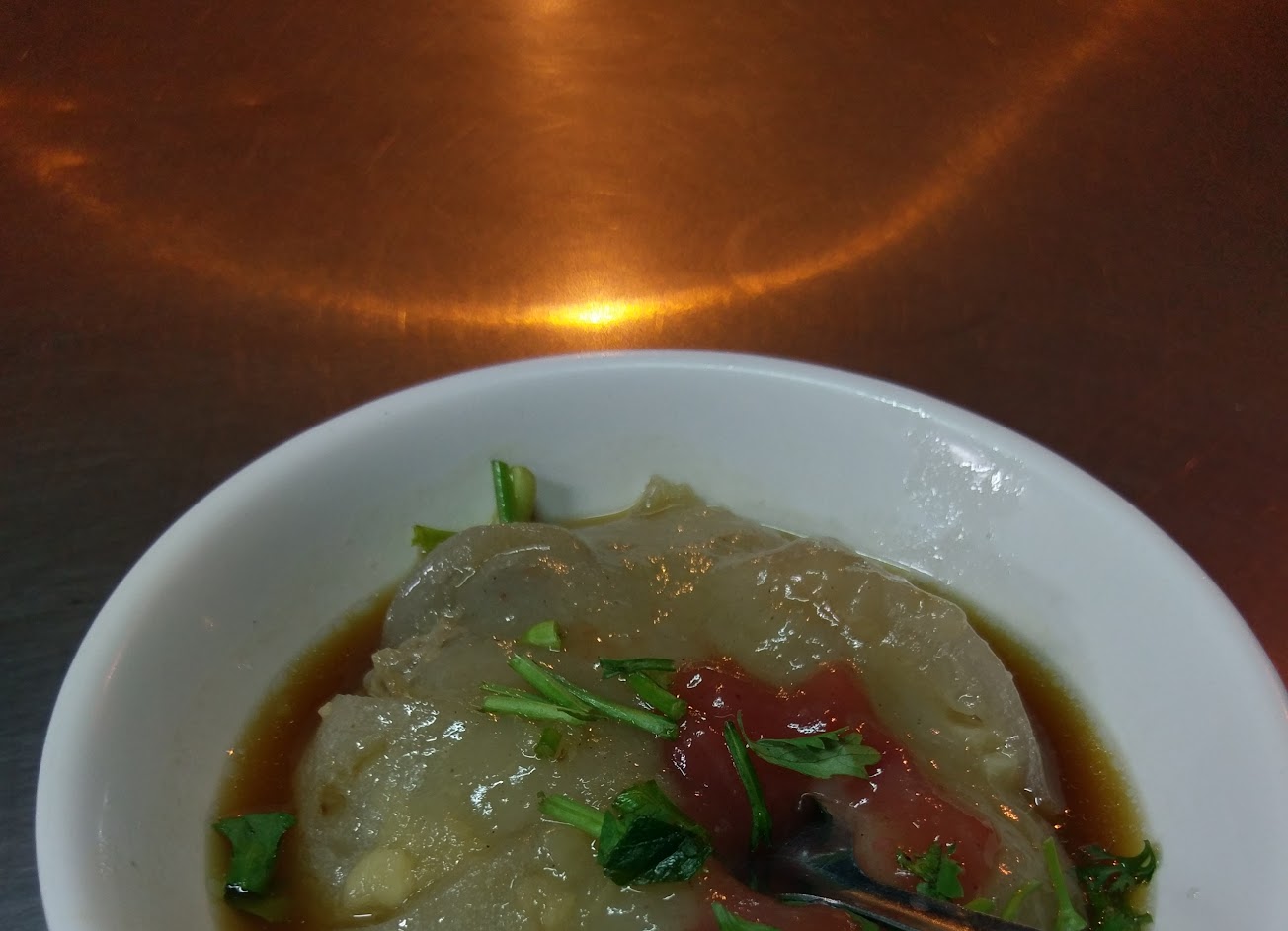 微酥脆的肉圓皮。 內餡有豬肉尬筍乾。 來點香菜尬上一點辣椒醬。