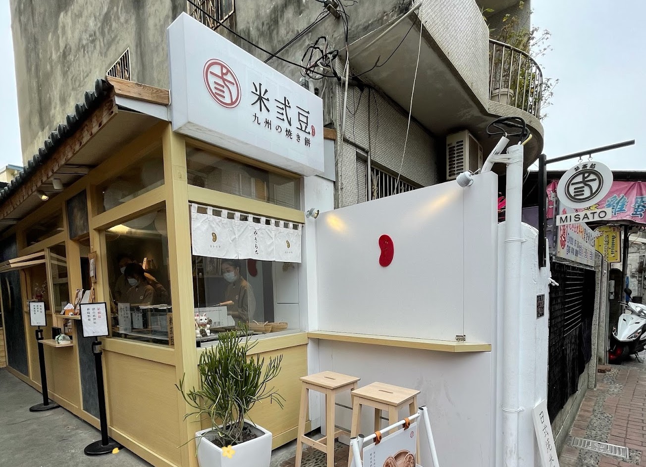 白色牆面搭配木質桌椅和logo及植栽,在老街裡面特別的醒目、好拍,呈現日式清新風,很適合拍照。