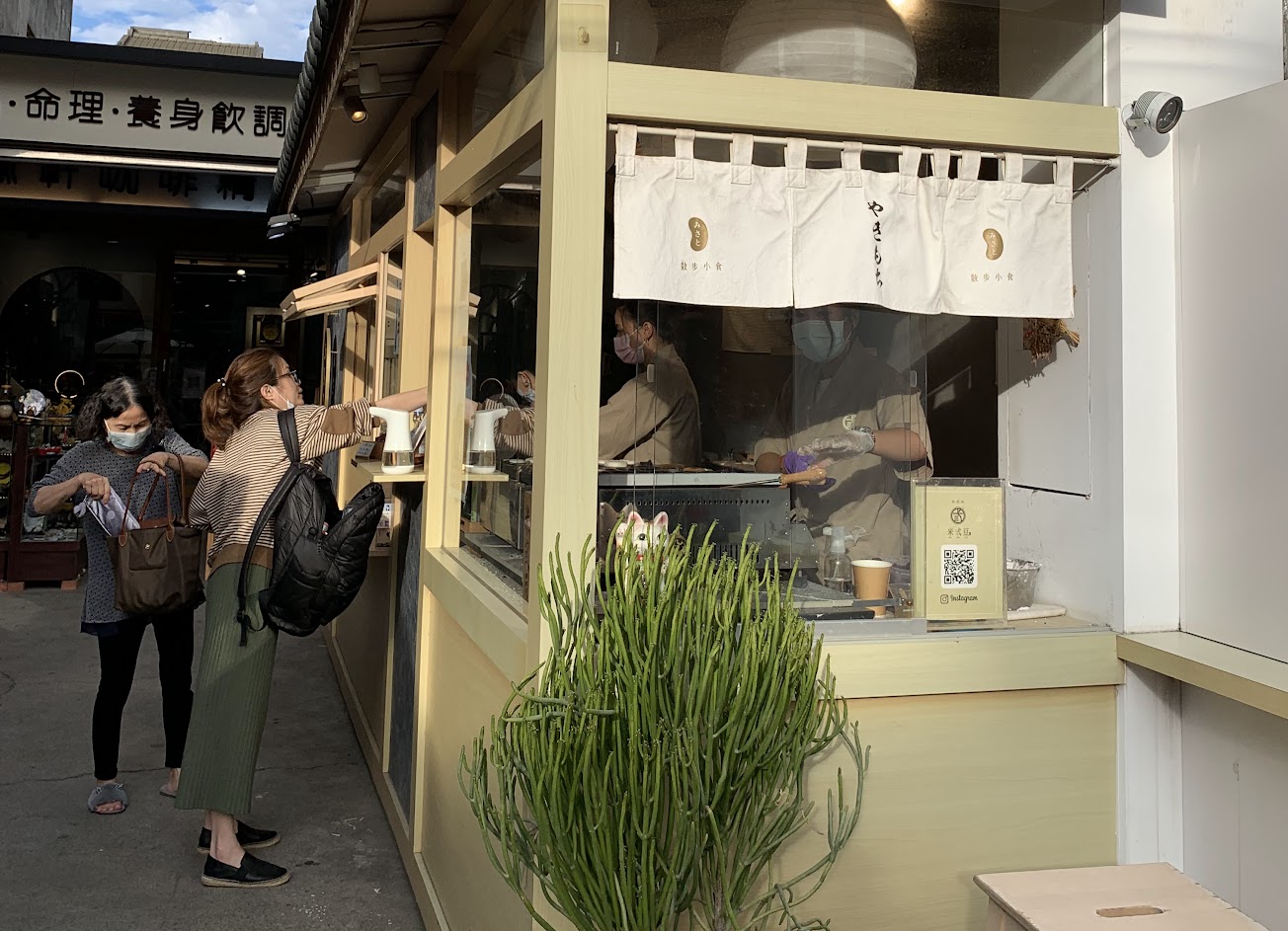很有日式風格的小攤。 現做的甜點。 吃起來有點像麻糬的口味 甜甜的熱熱的也有點像古早味的麵龜的口感。