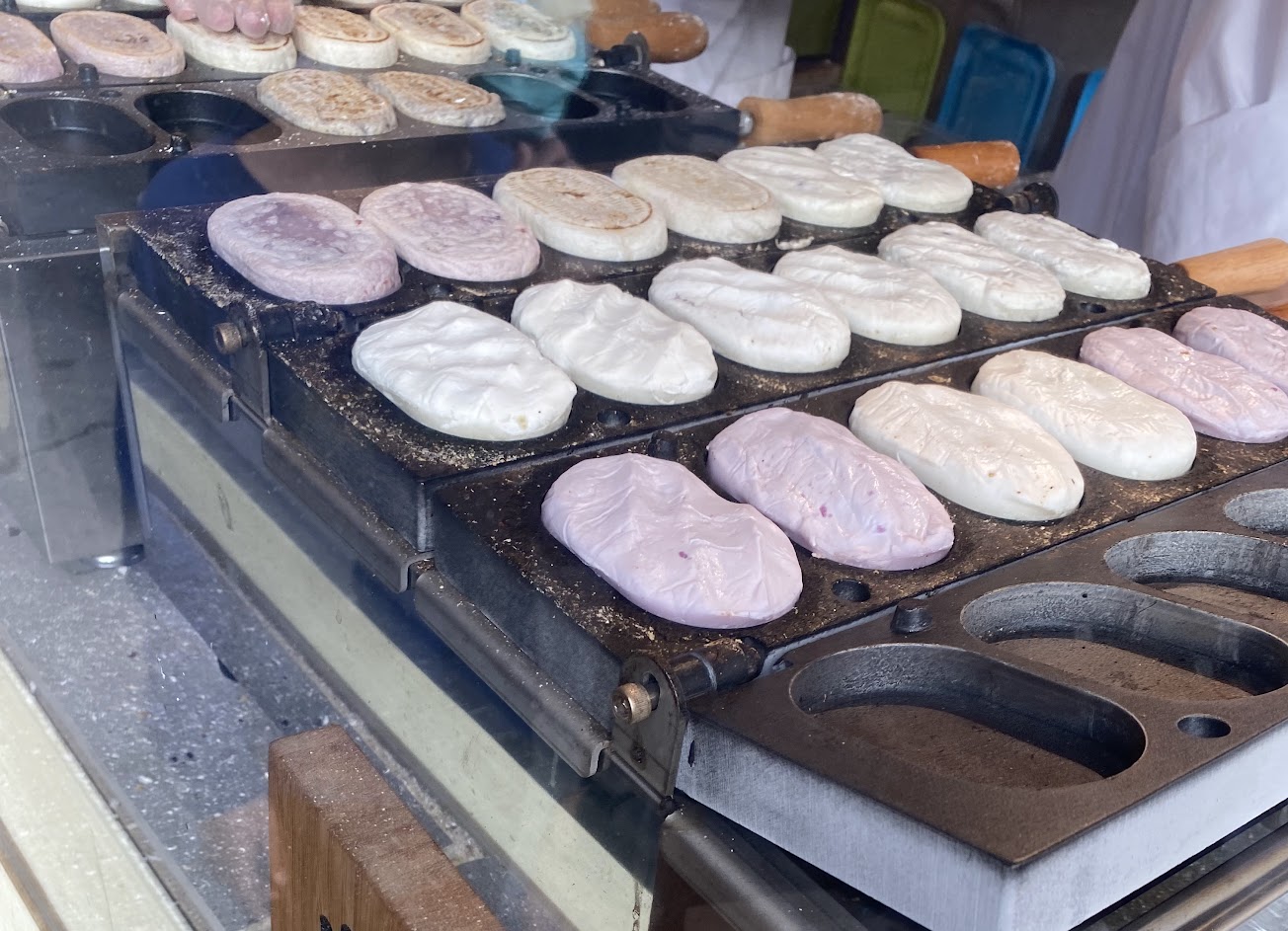 假日人很多,要抽號碼牌,需要等待一下子,有兩間店面,看起來很像台灣的車輪餅,只是形狀是橢圓型的,餅皮吃起來的口感有點像是烤麻糬,外面是酥酥的裡面微軟Q口感,有什麼口味我忘了拍,吃紅豆跟芝麻兩種,芝麻味道比較香濃,紅豆我覺得還好