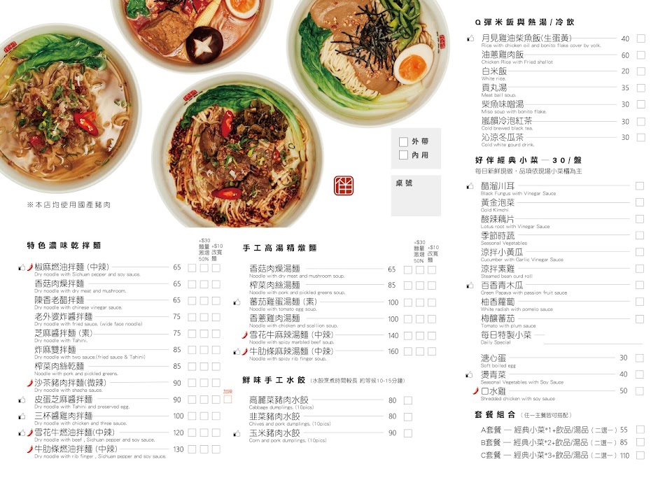 不過整體單價都偏高,也許是份量也比較多。? 網路上的菜單是彩色的看起來好吃很多~不過現場點單則是黑白的有點可惜。 服務 內用 餐點類型 晚餐 平均每人消費金額 $200-400