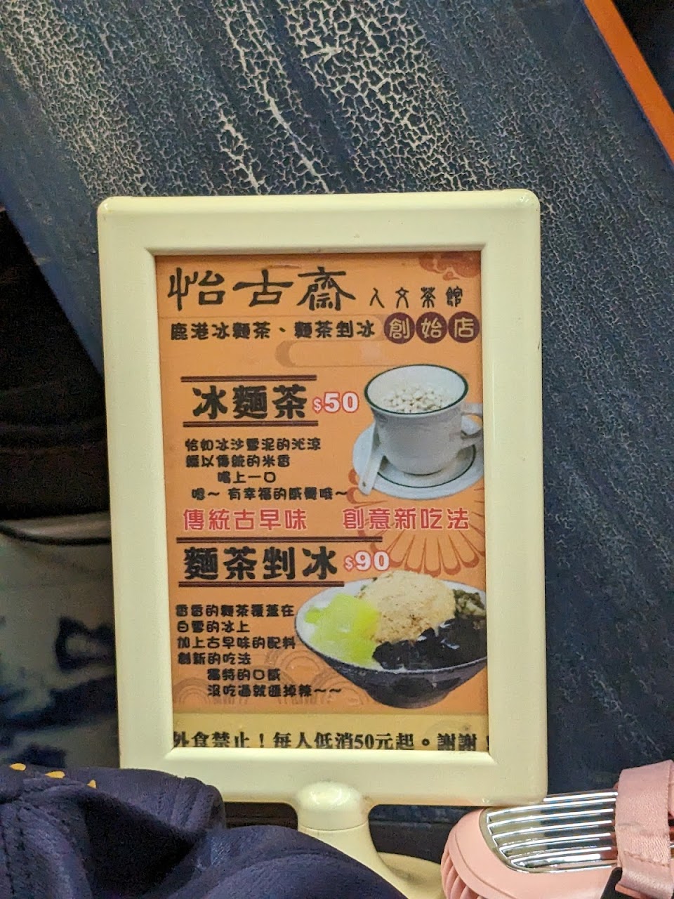 平日的鹿港老街人潮不多,走著走著被怡古齋的外觀及內部陳設所吸引,剛好當作休憇的點,點了一碗麵除剉冰及杏仁茶,兩樣都非常好吃,滿滿一碗剉冰有許多佐料,上面鋪滿一層麵茶粉,冰加上麵茶的香味,每一口都唇齒留香,吃著吃著暑意全消,杏仁茶口感非常濃郁,每一口都是古早味的回憶,已經好久沒有喝到這麼好喝的杏仁茶,店內有低消$40/人,看到有不少人對低消做法上的負面評論,個人認為店家可以採更圓融的標準,總額超過總人數低消即可,畢竟大家快快樂樂出遊,因為低消看法不同造成彼此的不愉快,對服務業而言實屬大忌,這次消費的感覺:服務人員態度很好、東西好吃、環境舒適,室內桌椅、牆壁上的掛飾都充滿古早的氛圍,價格也很公道是一間值得推薦的店。