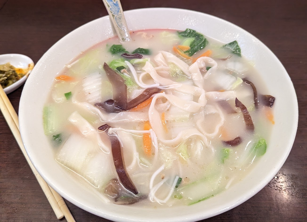 搶鍋麵: 湯頭很像是日式豚骨拉麵稍微一點點勾芡,味到很鮮,裡面有蔬菜和肉,是一道很清淡好吃的麵