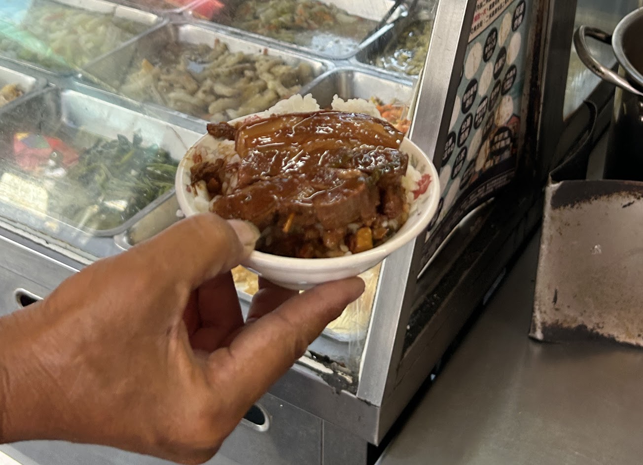 我們點的是「便當」、所以是主菜加上三樣配菜的選擇;配菜選擇上不多、主菜則是老闆會先問顧客對於肥瘦的喜好度。這一鍋內滿滿滷到透且噴香的豬肉,看到就讓我感覺到餓。