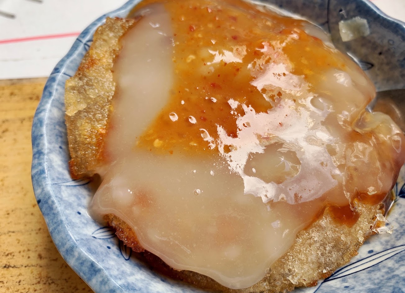 用花生油把外皮炸得酥脆,可惜不能內用,無法享用現炸滋味,外帶淋上白米醬及辣醬後,外皮Q喋喋,竹筍丁脆、瘦肉片香,吃來不油膩,比北斗肉圓還好吃。