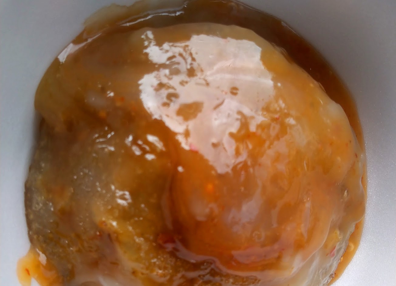 肉圓表皮軟軟的?!沒有感覺是炸的很酥脆的顏色! 一度以為是油泡系列的肉圓~ (看了評價才知道都是酥脆的??) 不曉得是不是因為外帶的關係,但我上車馬上就開吃了欸? 內餡筍子超多脆又甜,肉也很好吃~ 醬的口味覺得是真的蠻~甜的?