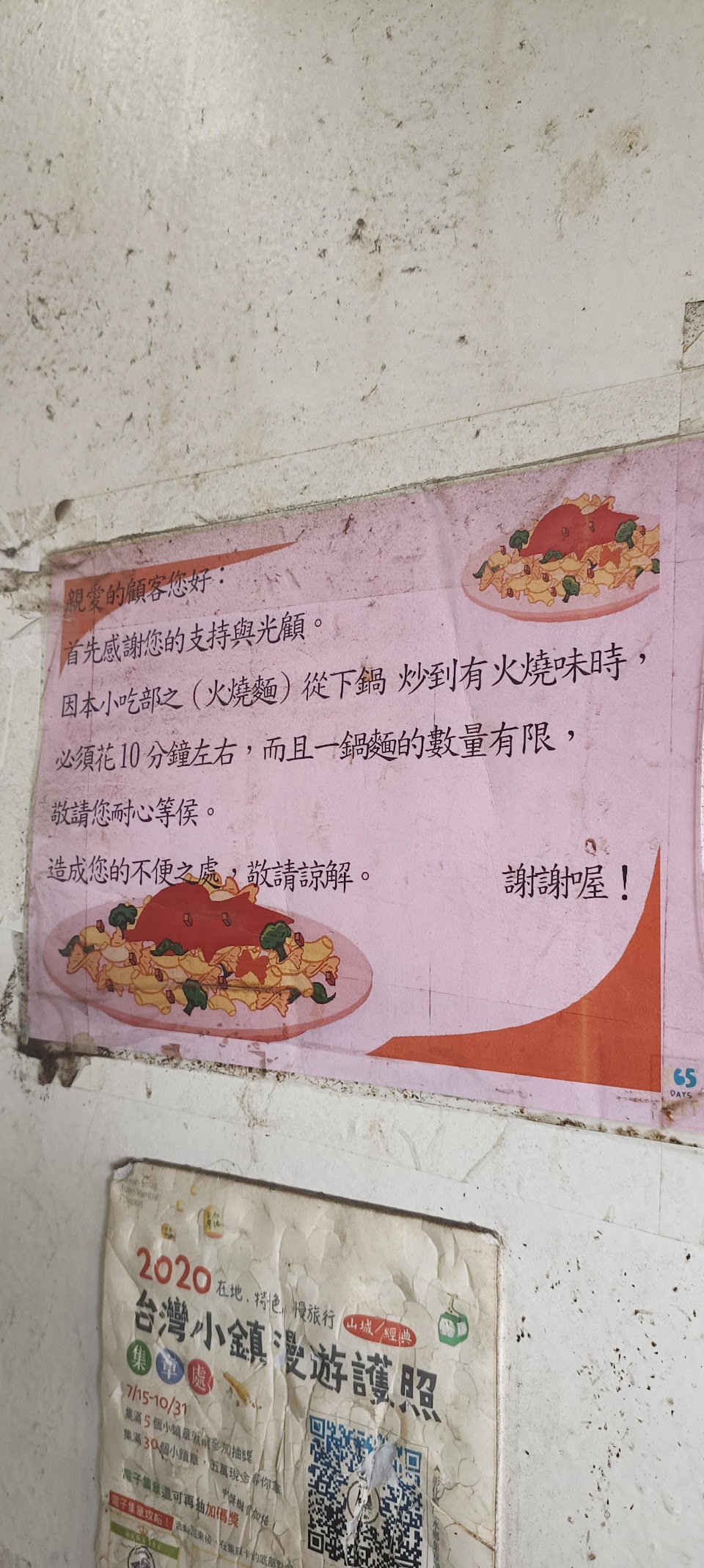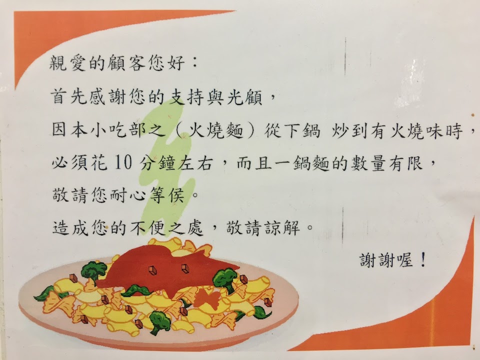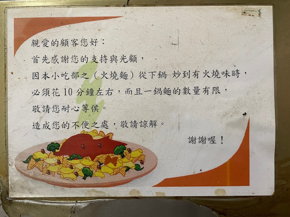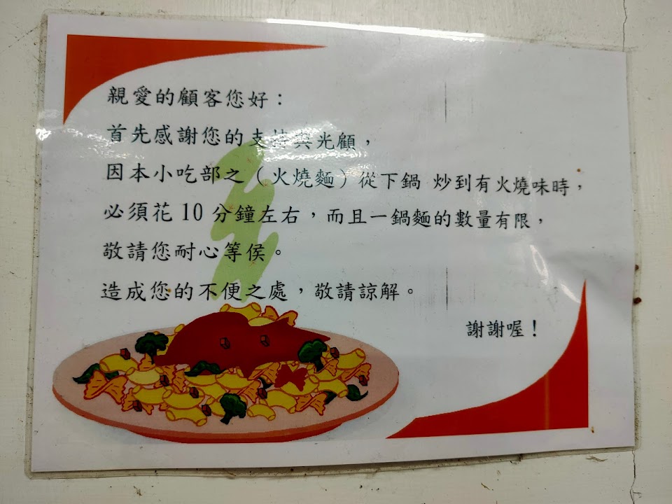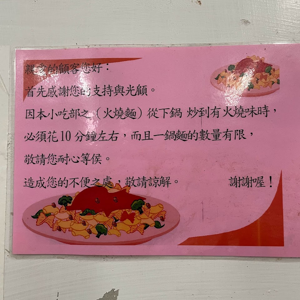 平日下午2點了,生意仍然滿滿人潮,只好外帶招牌火燒炒麵,看著老闆炒麵,應該是炒滿滿一鍋麵翻鍋不容易,以致鍋底焦了,麵有股燒焦味,就像永和豆漿有焦味一樣,其他菜色問了吃過的客人說好吃