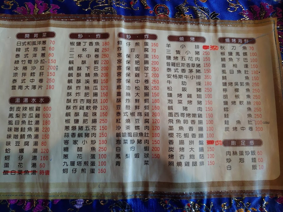 老闆熱情。值得一提的,是無與倫比的出菜速度。屁股都還沒坐熱,菜就已經上齊。不過,品質也都有顧到。這次點的菜有:炒飯、炒泡麵、九層塔蛋、鳳梨蝦球、三隻小豬(三種烤豬肉的拼盤)、苦瓜鹹蛋、蛤蜊湯等等。