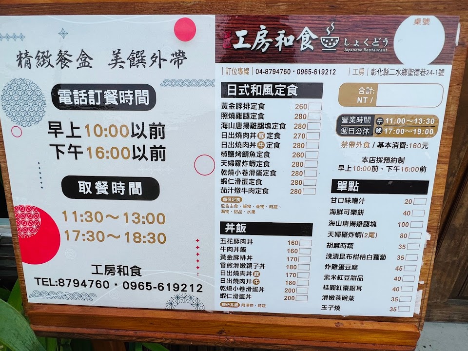 工房和食餐館是位於二水鄉,內外環境都有用心整理及布置得很雅緻,讓人很舒服,供應時間午餐11:00-13:30晚餐17:30-19:00,休週日,主要日式和風定食、丼飯為主,午餐我ㄧ個人點了照燒雞腿定食300元,有主餐照燒雞腿及附餐蒸蛋、青菜沙拉、味噌湯及飯後紅豆白玉甜湯、水果小玉,還好有請老闆娘白飯裝少一點,不然會吃得太飽很撐,今天生意不錯都是採預約的客人,因我是初次造訪不知要預約就直接跑來了,還好謝謝老闆娘看我只ㄧ個人就沒有讓我鍛羽而歸,只是下次要帶家人過來我ㄧ定會先預約的了,鄉下有這種水準的餐廳很不錯,整體今天吃得開心也很滿意