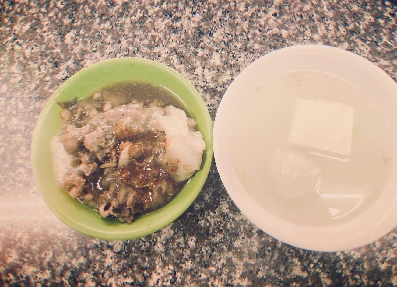 傳統的小肉圓兩顆或三顆自選價位也不同,裡面有碎肉與筍塊,胡椒的香氣蠻重的,皮很Q不爛很好吃。另外點了湯吃起來是一顆虱目魚丸與一塊豆腐,味道略顯普通。