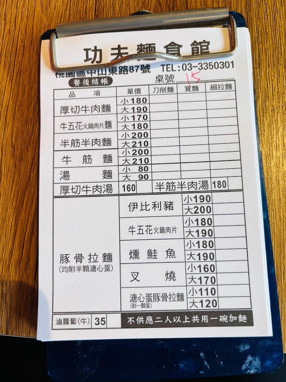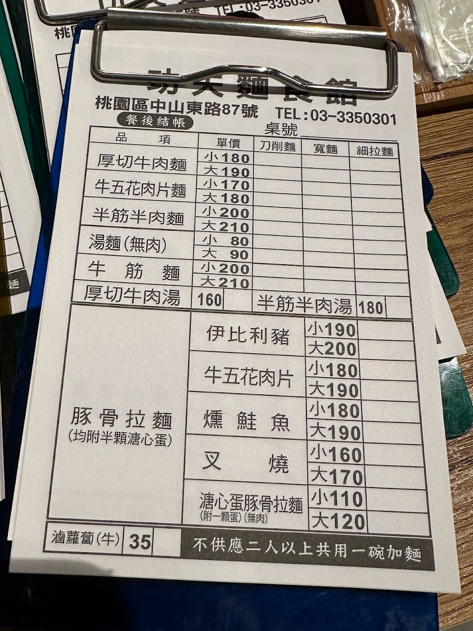 就桃園地區來說價格屬於中上,湯底味道香濃不會過鹹,算是喝過數一數二的湯頭,不過我本來要改點刀削麵而且也跟店員確認過沒問題,最後卻還是給我寬麵……再來第一塊入口的牛肉有點硬咬不動,後面的幾塊口感就不錯,希望店家能更多注意點單的正確性及牛肉品質的一致性