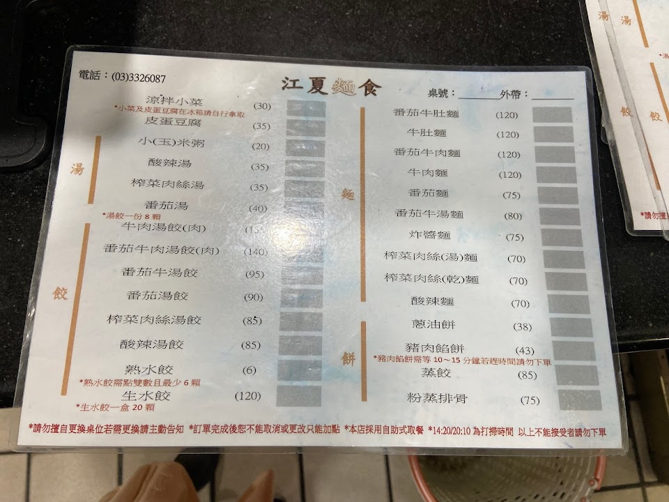 用餐時 生意很好喔 外帶可以提早11:00打電話可以打9折吧 還是覺得江夏麵食館的麵條最好吃,彈Q.湯頭也棒,久久還是想要大老遠來回味一番,酸辣湯更是我吃過最好吃的,料多實在,味道也十足。加上黑醋更是一絕。 停車位不易,尤其是週間,這裡更是一位難求。