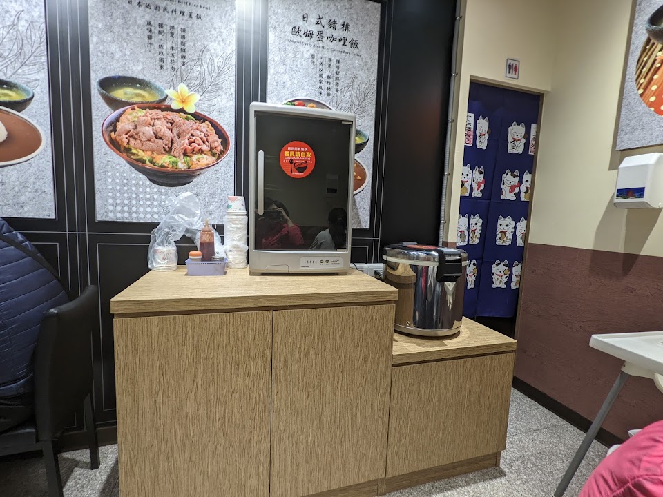 食物很美味,提供一次日式咖哩飯加飯加醬服務,飲料打爆飲料店的價格,是早餐店的奶茶哦,餐具、湯自取,有招牌店貓(給摸,超乖),大家快用新台幣支持老闆 ^ ^