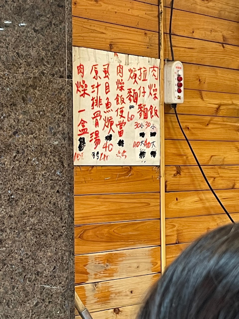 買了肉燥飯一大一小,拉仔麵小的,一碗虱目魚羹,小菜點了一份燒肉跟豆腐,店家收了$310