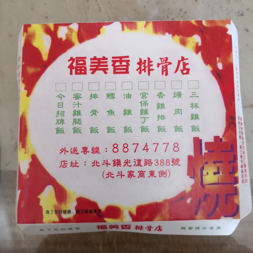 很讚,北斗最好吃的便當店,排骨便當超棒的,我是女生但我食量跟男生一樣大,他們的飯很夠還有附一小袋菜ㄅㄡˋ跟熱湯,你可以跟他要,菜也超好吃不會很油,也很少有那種大家排名最討厭吃的那幾樣便當菜,我從臺中來到北斗住,只吃的習慣這家,福美香的排骨便當我天天吃都不會膩,可惜只有開中午這樣,你們別跟我搶,我幾乎每天中午都會來買,我不想排隊,請跟我錯開時間,我想趕快買完然後享受,店員都很親切而且出餐速度還行,不過他們中午蠻忙的請多體諒店家