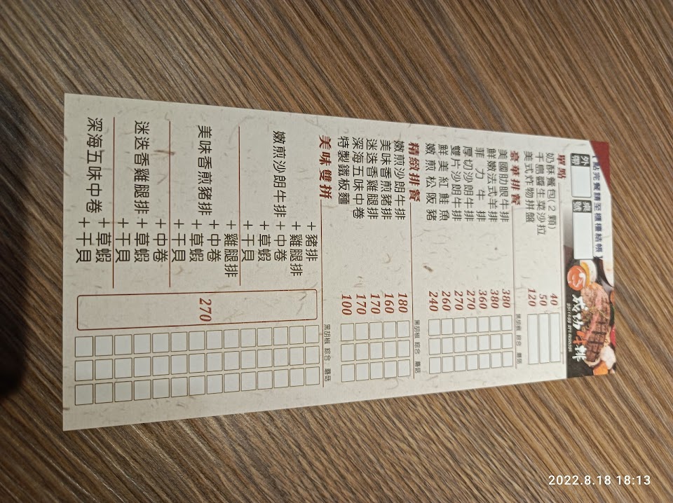 以這個價位來說,肉質算還可以,只是煎烤時火候/時間需再加強一下,避免煎烤稍乾/硬(牛肉)或不夠熟(雞排),近幾月外帶次數約四次、內用二次,年輕弟弟/妹妹服務態度都不錯,店家人員招募/管理的好,所以總分給五星