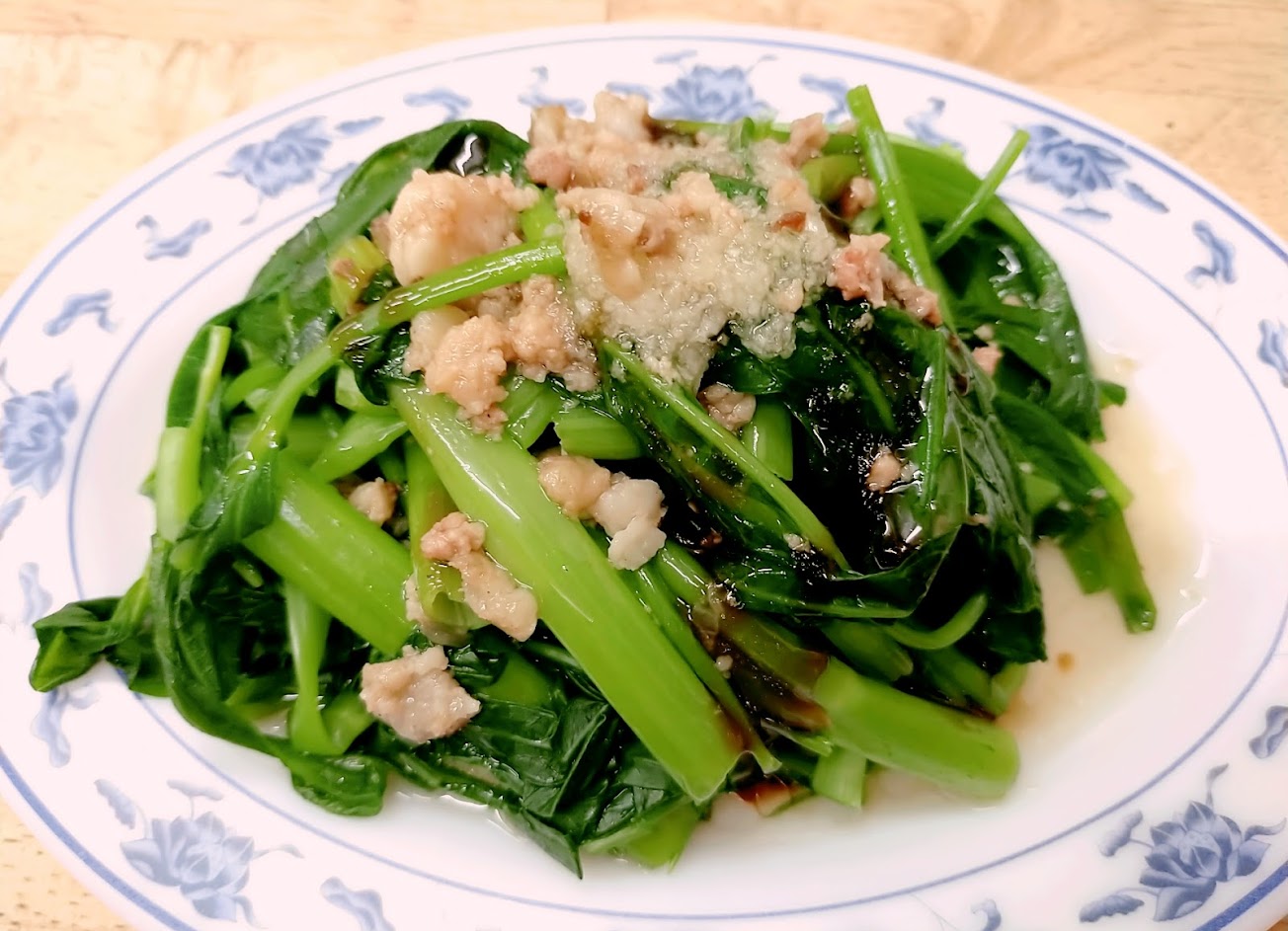 燙青菜(25)當時有空心菜雨地瓜葉可選,上頭淋肉燥,蒜泥,及醬油調味,清脆好吃。