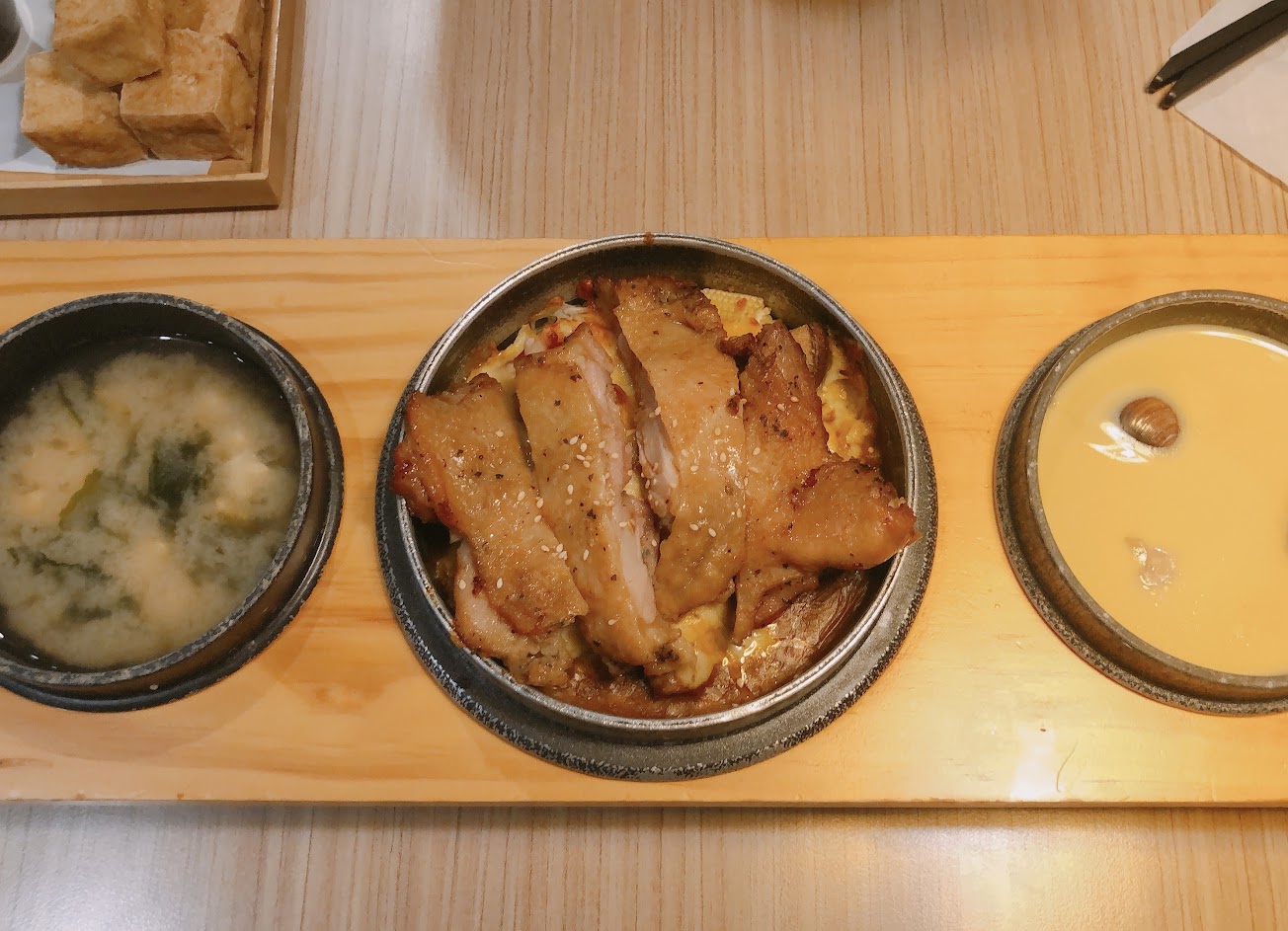 吃的出來是真材實料,我今天自己點的是烤咖喱,非常有特色!在濃郁的咖喱飯上面鋪上起司再去烘烤而成,熱騰騰出爐~起司大牽絲!主食選擇了鮮嫩雞腿,非常大塊而且很嫩很多汁,附餐有一碗豆腐清湯跟茶碗蒸,以為湯會沒什麼味道,殊不知是鮮魚熬煮的,味道很鮮甜,茶碗蒸裡面的料也出乎意料的有海鮮?
