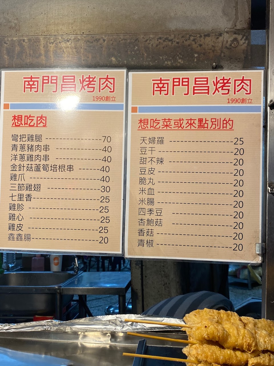 推青蔥豬肉串、七里香。