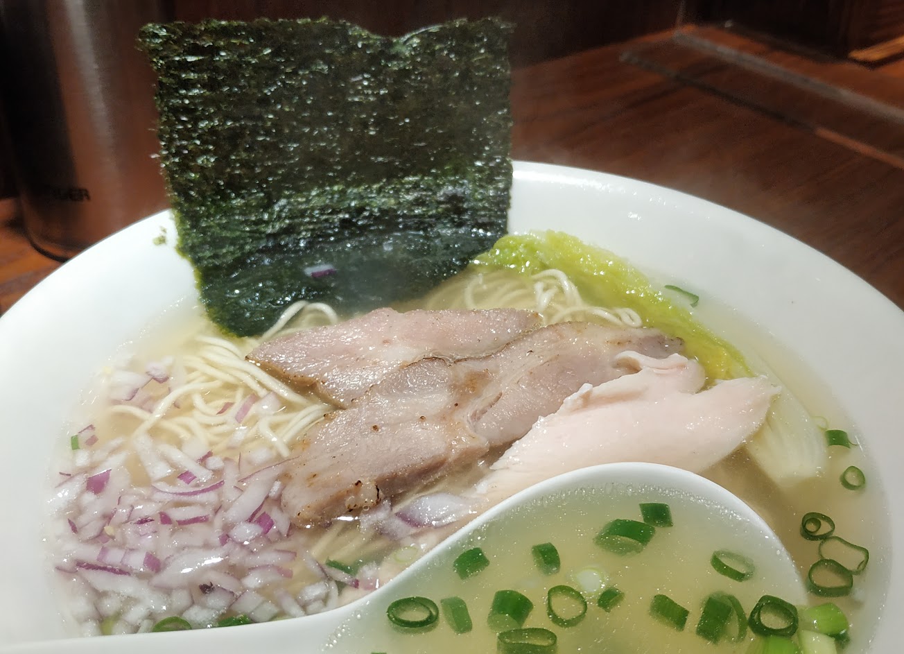 《鹽味拉麵 大骨跟雞熬的湯清爽卻富有層次,舒肥過的雞叉燒非常軟嫩,值得一提的是豬肉叉燒,不僅口感一樣軟嫩有嚼勁炙燒過的表面讓每咬一口豬肉的香氣就更加明顯讓我非常驚艷,麵本身雖然沒辦法調整軟硬度,但店家的掌握對我而言恰到好處,搭配蔥和洋蔥的輔助是一碗讓人從到到尾都不會膩。醬油跟鹽味跟店家一樣首推鹽味,醬油的香氣也很豐富,但稍微掩蓋到原本湯頭的味道,想換個口味時是個不錯的選擇。