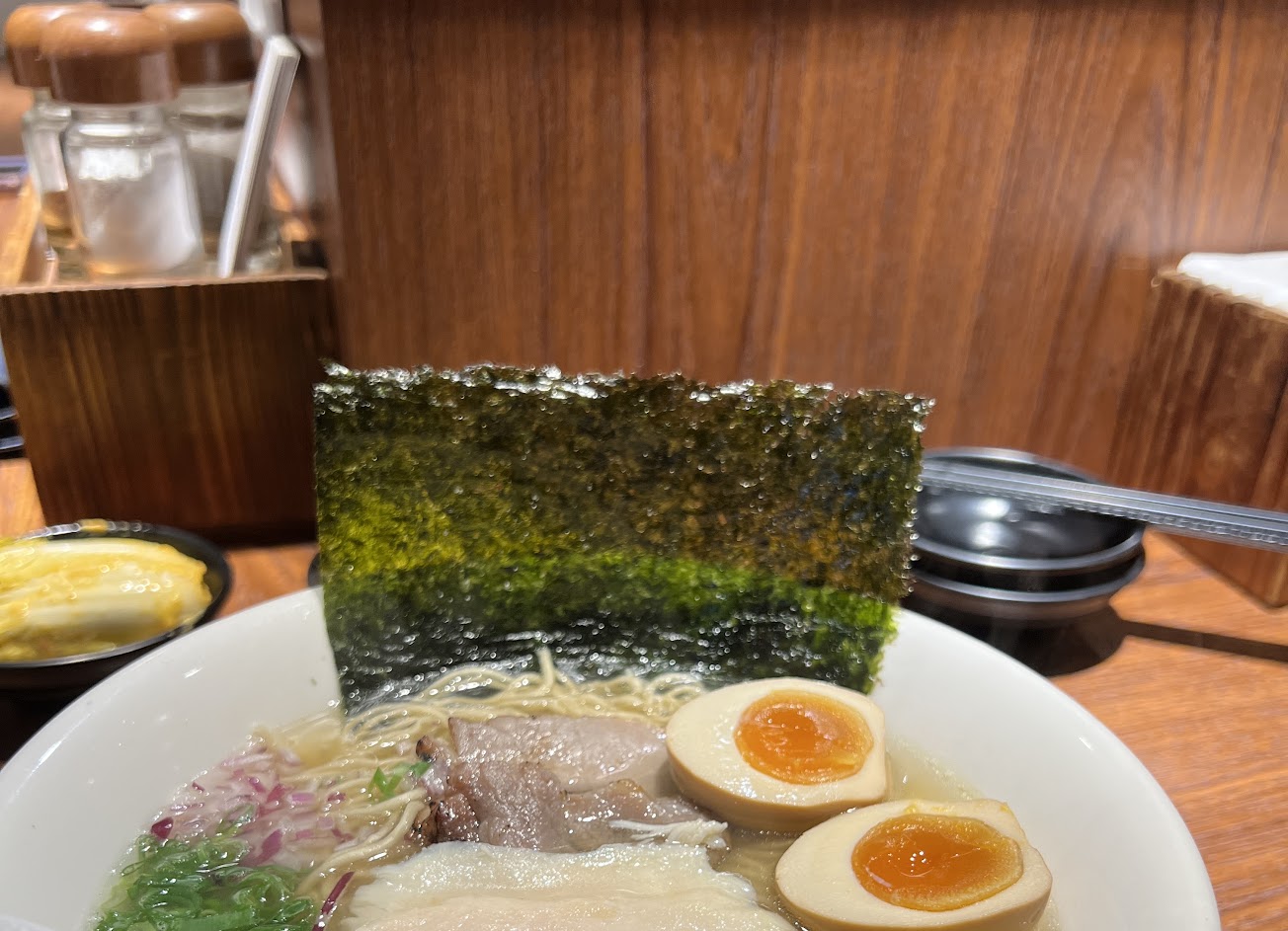 點餐後餐點製作快速,工作區乾淨,炙燒的肉片很香,雞肉叉燒超級薄….(刀工好但真的吃起來很空虛),糖心蛋$+30中規中矩,座位區很小,店員會不時從身後擠過,$150鹽味的很鹹,$170味增的更鹹,鹹到沒辦法喝湯、鹹到刺喉嚨,$+15兩種麵吃起來沒什麼差別也偏硬,太鹹了不符合自己的口味