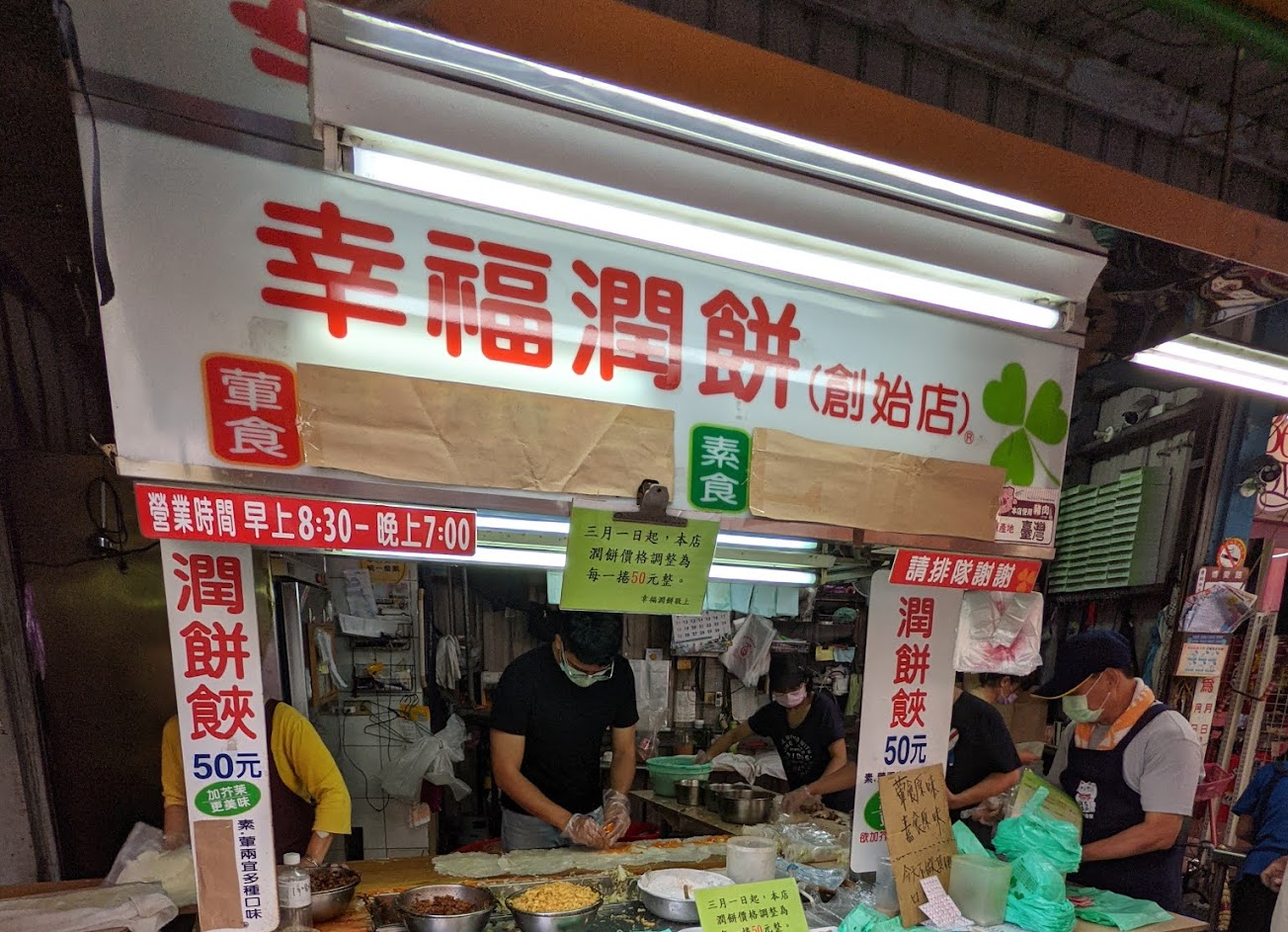 很好吃的潤餅店,經常要排隊,可以調整口味也不會不耐煩,陸續有微漲價,目前一卷$50,有附湯可自己裝取,位於市場內,騎車較方便。