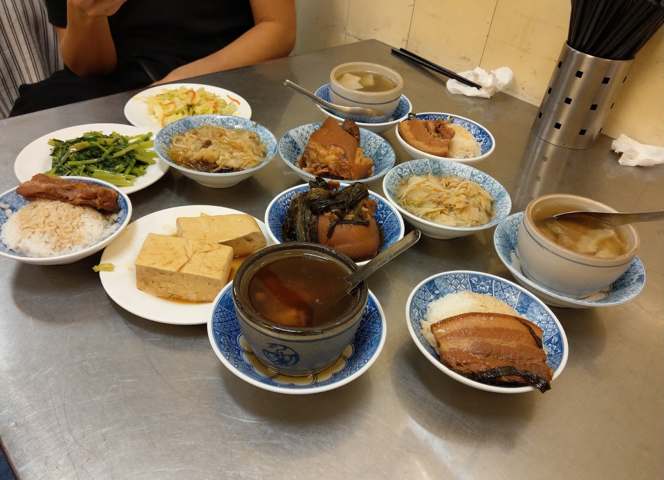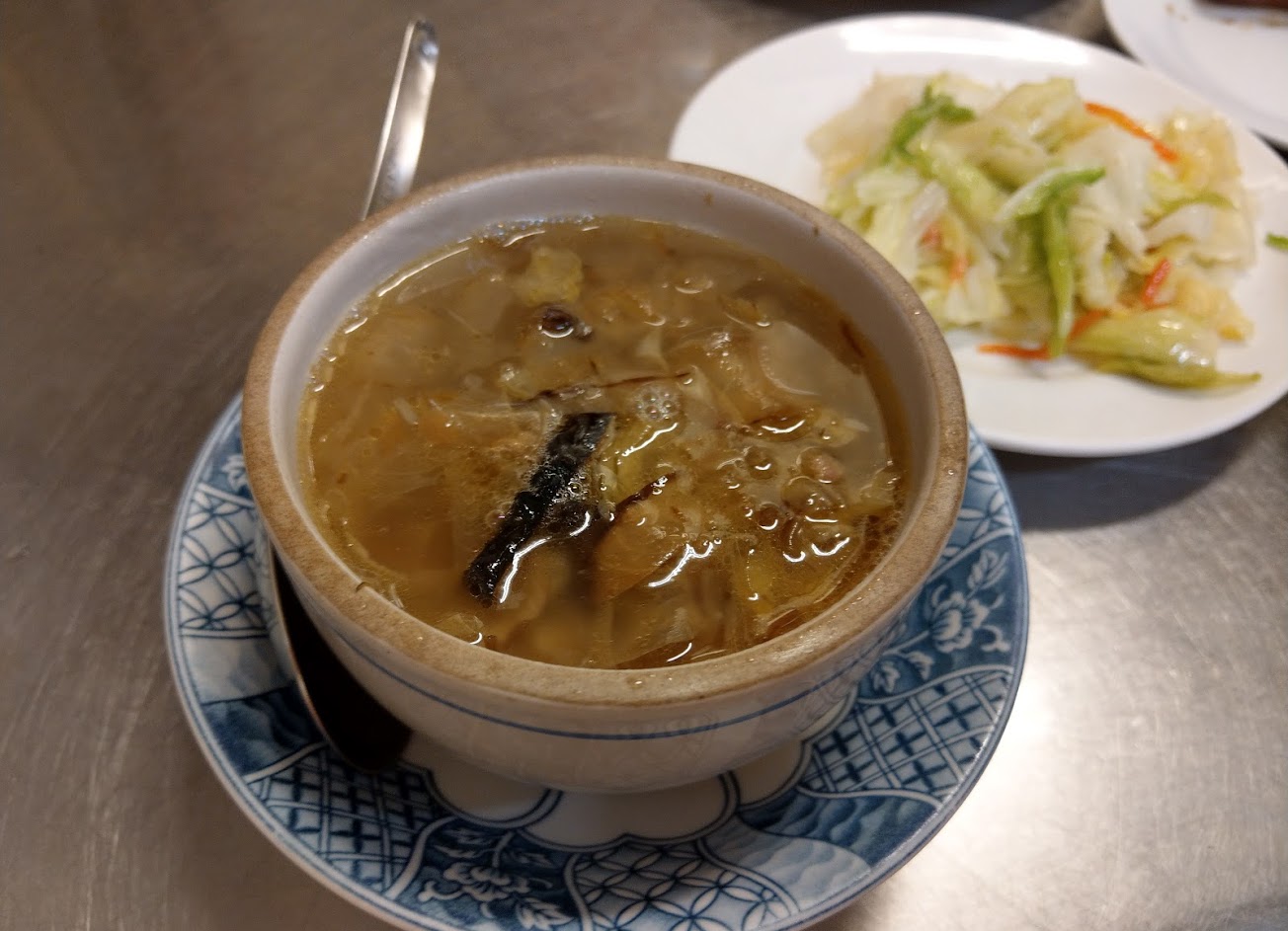 東西大致都好吃,苦瓜排骨湯很好喝,豆腐還不錯,白菜魯湯普通,肉燥飯是爌肉的瘦肉撕成絲,小特別。價格在中部沒有很便宜,肉燥飯30,排骨飯沒配菜45,湯40左右,份量都不是挺多,一個人消費100左右。