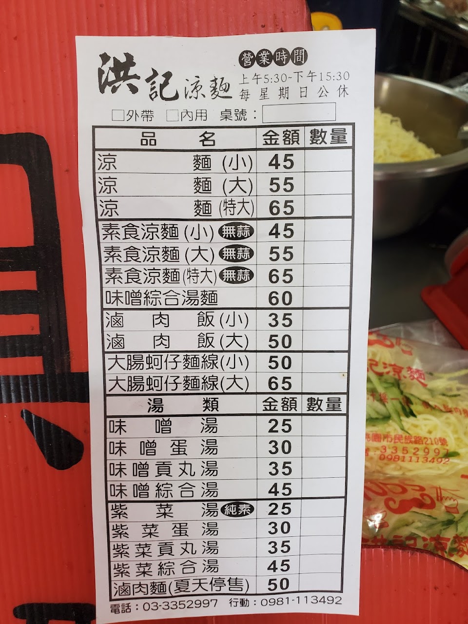 朋友推薦說洪記的涼麵很好吃我還把他洗臉勒,說我涼麵吃了好多人家介紹說好吃的都被我說NO,台北只有幾家口碑不錯的我就覺得不錯,像忠孝東路4段以琳書局旁的巷子每到中午11點就大排長龍,吼有十幾年沒去吃了,,蘭花亭涼麵,阿宗涼麵,有幾家忘記店名了,搬來桃園後,聊到有好吃的涼麵怎會放過,立即委託朋友幫忙買,吃過後認為口感真的不錯,可是他們的味增湯的湯頭以我各人認為就淡了點但是不影響涼麵給我的口感,真的不錯,今天12/25日又託朋友幫買3份大的回家一飽口福