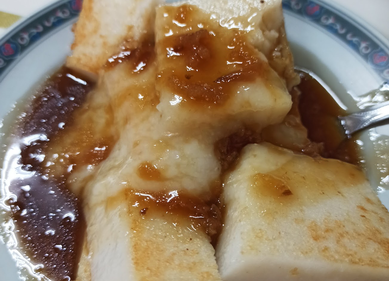 招牌芋蔥粿的外皮與碗粿相同,內餡是帶了點芋泥丁與芋泥的口感,將芋泥兼拌點油蔥和絞肉在裡面,再淋上特製微甜的醬油膏,不愛油蔥的我,淡淡香氣的層次風味很特別,是別處沒有的小吃。