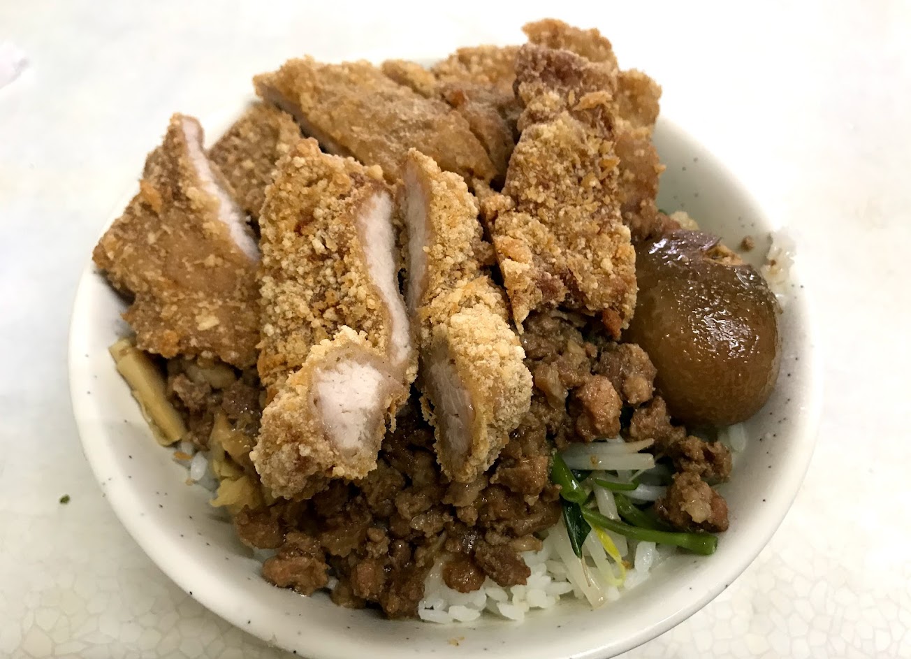 高CP值巷口美食,酥脆帶有醃製香甜的排骨,在飯上淋上滷肉,是犒賞自己一頓快樂食物的好選擇!